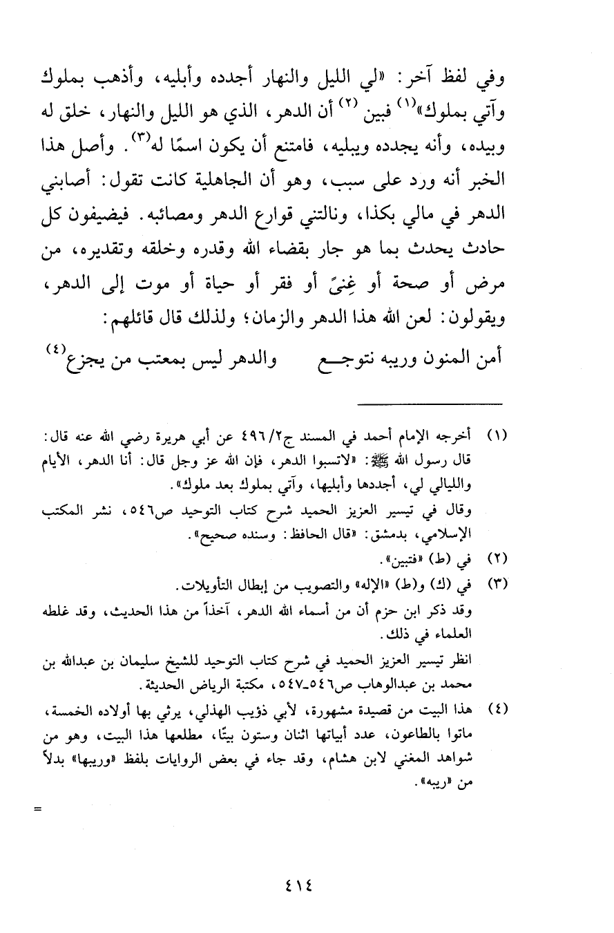 وفي لفظ آخر: «لي الليل والنهار أجدده وأبليه، وأذهب بملوك وآتي بملوك» فبين أن الدهر، الذي هو الليل والنهار، خلق له وبيده، وأنه يجدده ويبليه، فامتنع أن يكون اسمًا له. وأصل هذا الخبر أنه ورد على سبب، وهو أن الجاهلية كانت تقول: أصابني الدهر في مالي بكذا، ونالتني قوارع الدهر ومصائبه. فيضيفون كل حادث يحدث بما هو جار بقضاء الله وقدره وخلقه وتقديره، من مرض أو صحة أو غِنًى أو فقر أو حياة أو موت إلى الدهر، ويقولون: لعن الله هذا الدهر والزمان؛ ولذلك قال قائلهم: