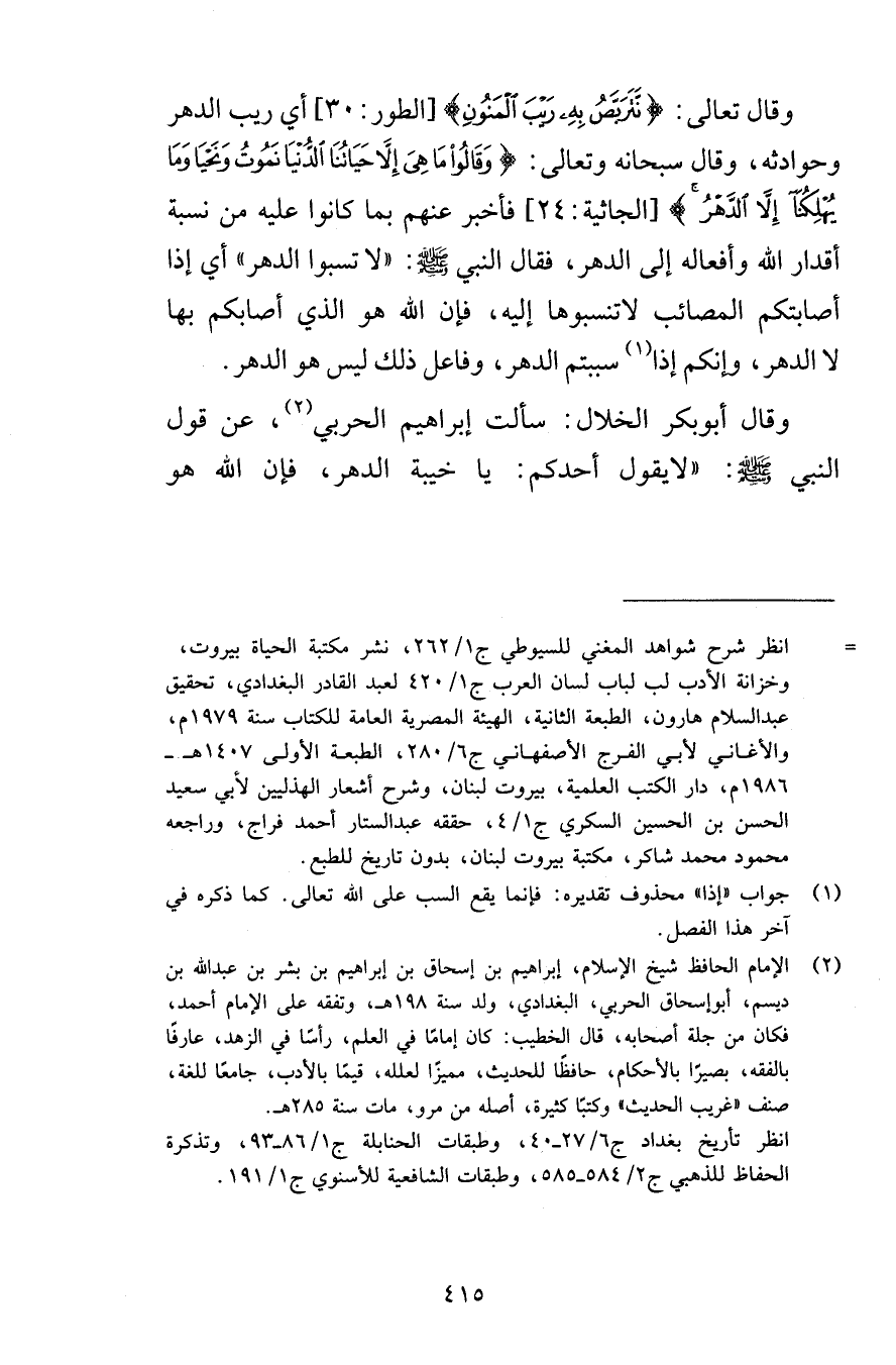 وقال أبو بكر الخلال: سألت إبراهيم الحربي، عن قول النبي صلى الله عليه وسلم: «لا يقول أحدكم: يا خيبة الدهر، فإن الله هو