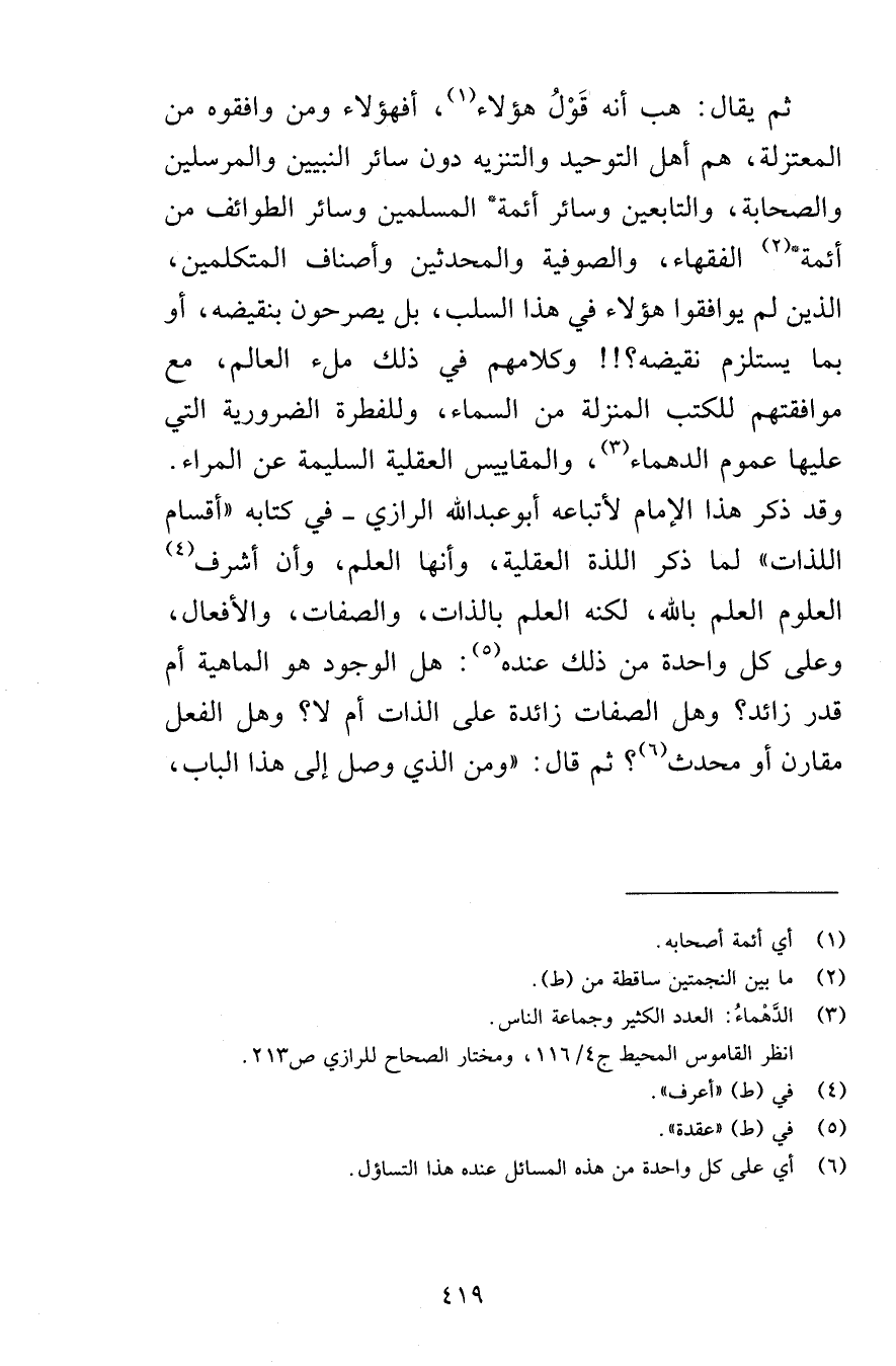 ثم يقال: هب أنه قَوْلُ هؤلاء، أفهؤلاء ومن وافقوه من المعتزلة، هم أهل التوحيد والتنزيه دون سائر النبيين والمرسلين والصحابة، والتابعين وسائر أئمة *المسلمين وسائر الطوائف من أئمة* الفقهاء، والصوفية والمحدثين وأصناف المتكلمين، الذين لم يوافقوا هؤلاء في هذا السلب، بل يصرحون بنقيضه، أو بما يستلزم نقيضه؟!! وكلامهم في ذلك ملء العالم، مع موافقتهم للكتب المنزلة من السماء، وللفطرة الضرورية التي عليها عموم الدهماء، والمقاييس العقلية السليمة عن المراء. وقد ذكر هذا الإمام لتباعه أبو عبد الله الرازي - في كتابه «أقسام اللذات» لما ذكر اللذة العقلية، وأنها العلم، وأن أشرف العلوم العلم بالله، لكنه العلم بالذات، والصفات، والأفعال، وعلى كل واحدة من ذلك عنده: هل الوجود هو الماهية أم قدر زائد؟ وهل الصفات زائدة على الذات أم لا؟ وهل الفعل مقارن أو محدث؟ ثم قال: «ومن الذي وصل إلى هذا الباب،