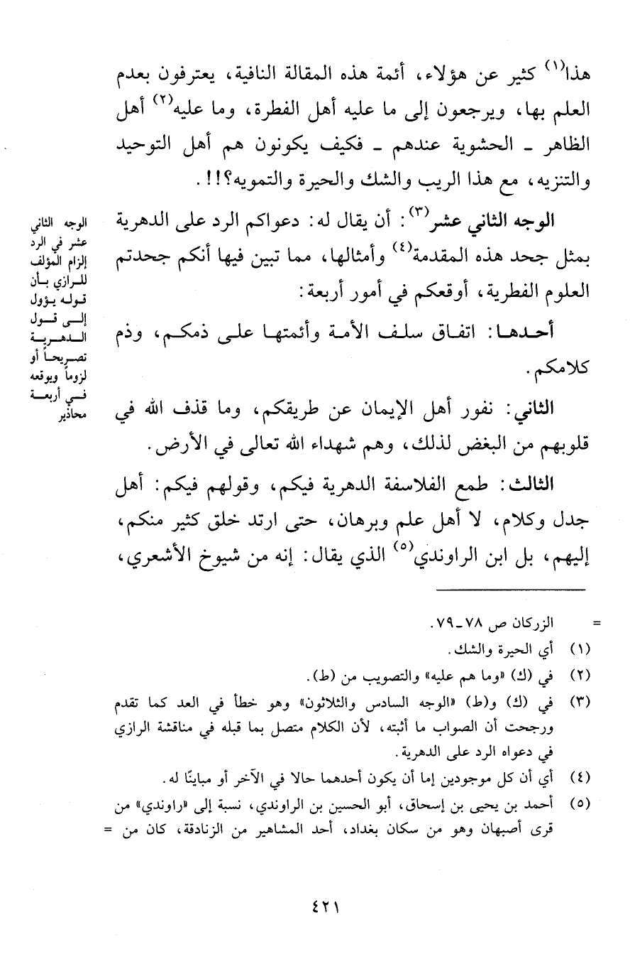 الثالث: طمع الفلاسفة الدهرية فيكم، وقولهم فيكم: أهل جدل وكلام، لا أهل علم وبرهان، حتى ارتد خلق كثير منكم، إليهم، بل ابن الراوندي الذي يقال: إنه من شيوخ الأشعري،