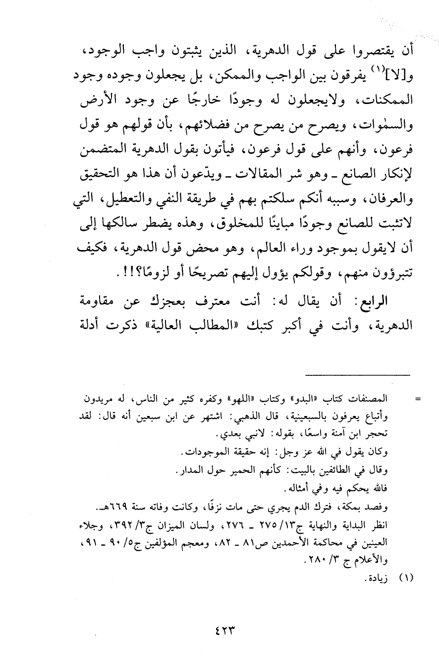 الرابع: أن يقال له: أنت معترف بعجزك عن مقاومة الدهرية، وأنت في أكبر كتبك «المطالب العالية» ذكرت أدلة