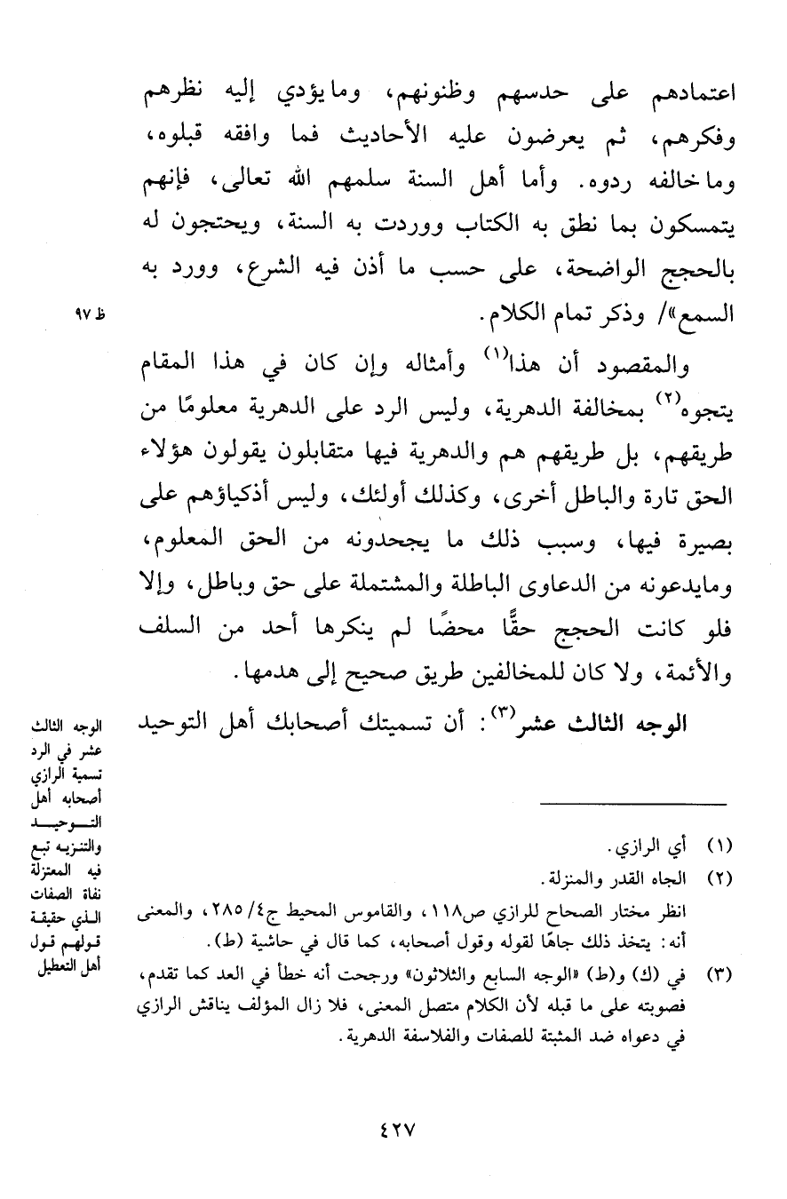 والمقصود أن هذا وأمثاله وإن كان في هذا المقام يتجوه بمخالفة الدهرية، وليس الرد على الدهرية معلومًا من طريقهم، بل طريقهم هم والدهرية فيها متقابلون يقولون هؤلاء الحق تارة والباطل أخرى، وكذلك أولئك، وليس أذكياؤهم على بصيرة فيها، وسبب ذلك ما يجحدونه من الحق المعلوم، وما يدعونه من الدعاوى الباطلة والمشتملة على حق وباطل، وإلا فلو كانت الحجج حقًّا محضًا لم ينكرها أحد من السلف والأئمة، ولا كان للمخالفين طريق صحيح إلى هدمها.