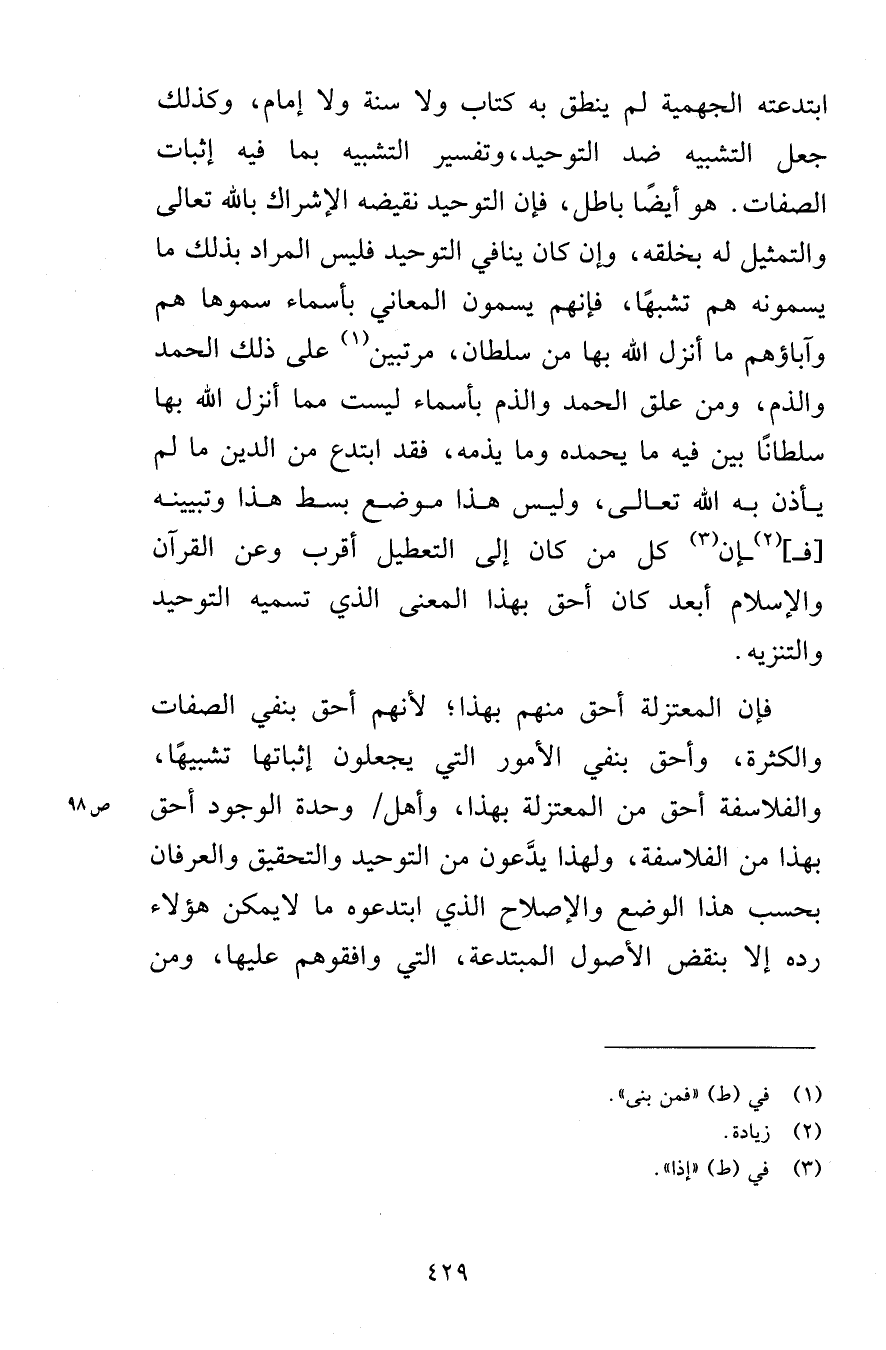 فإن المعتزلة أحق منهم بهذا؛ لأنهم أحق بنفي الصفات والكثرة، وأحق بنفي الأمور التي يجعلون إثباتها تشبيهًا، والفلاسفة أحق من المعتزلة بهذا، وأهل وحدة الوجود أحق بهذا من الفلاسفة، ولهذا يدَّعون من التوحيد والتحقيق والعرفان بحسب هذا الوضع والإصلاح الذي ابتدعوه ما لا يمكن هؤلاء رده إلا بنقض الأصول المبتدعة، التي وافقوهم عليها، ومن