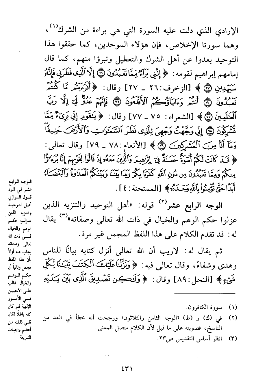 الإرادي الذي دلت عليه السورة التي هي براءة من الشرك، وهما سورتا الإخلاص، فإن هؤلاء الموحدين، كما حققوا هذا التوحيد بعدوا عن أهل الشرك والتعطيل وتبرؤا منهم، كما قال إمامهم إبراهيم لقومه: إِنَّنِي بَرَاءٌ مِّمَّا تَعْبُدُونَ (26) إِلَّا الَّذِي فَطَرَنِي فَإِنَّهُ سَيَهْدِينِ (27) } [الزخرف: 26-27] وقال: {أَفَرَأَيْتُم مَّا كُنتُمْ تَعْبُدُونَ (75) أَنتُمْ وَآبَاؤُكُمُ الْأَقْدَمُونَ (76) فَإِنَّهُمْ عَدُوٌّ لِّي إِلَّا رَبَّ الْعَالَمِينَ (77) } [الشعراء: 75-77] وقال: {يَا قَوْمِ إِنِّي بَرِيءٌ مِّمَّا تُشْرِكُونَ (78) إِنِّي وَجَّهْتُ وَجْهِيَ لِلَّذِي فَطَرَ السَّمَاوَاتِ وَالْأَرْضَ حَنِيفًا وَمَا أَنَا مِنَ الْمُشْرِكِينَ (79) } [الأنعام: 78-79] وقال تعالى: {قَدْ كَانَتْ لَكُمْ أُسْوَةٌ حَسَنَةٌ فِي إِبْرَاهِيمَ وَالَّذِينَ مَعَهُ إِذْ قَالُوا لِقَوْمِهِمْ إِنَّا بُرَآءُ مِنكُمْ وَمِمَّا تَعْبُدُونَ مِن دُونِ اللَّهِ كَفَرْنَا بِكُمْ وَبَدَا بَيْنَنَا وَبَيْنَكُمُ الْعَدَاوَةُ وَالْبَغْضَاء أَبَدًا حَتَّى تُؤْمِنُوا بِاللَّهِ وَحْدَهُ} [الممتحنة: 4] .