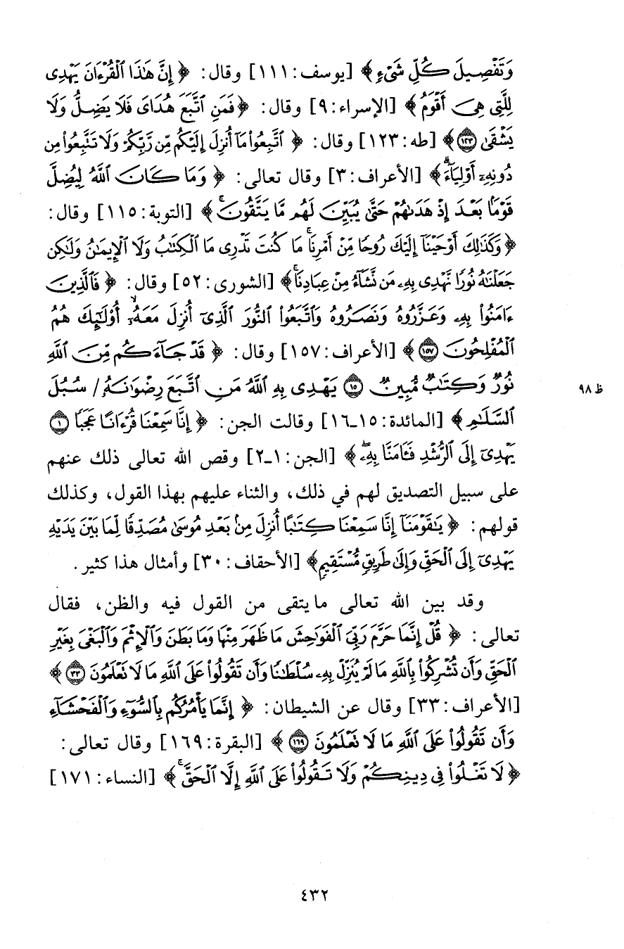 وَتَفْصِيلَ كُلَّ شَيْءٍ} [يوسف: 111] وقال: {إِنَّ هَذَا الْقُرْآنَ يِهْدِي لِلَّتِي هِيَ أَقْوَمُ} [الإسراء: 9] وقال: {فَمَنِ اتَّبَعَ هُدَايَ فَلَا يَضِلُّ وَلَا يَشْقَى (123) } [طه: 123] وقال: {اتَّبِعُوا مَا أُنزِلَ إِلَيْكُم مِّن رَّبِّكُمْ وَلَا تَتَّبِعُوا مِن دُونِهِ أَوْلِيَاءَ} [الأعراف: 3] وقال تعالى: {وَمَا كَانَ اللَّهُ لِيُضِلَّ قَوْمًا بَعْدَ إِذْ هَدَاهُمْ حَتَّى يُبَيِّنَ لَهُم مَّا يَتَّقُونَ} [التوبة: 115] وقال: وَكَذَلِكَ أَوْحَيْنَا إِلَيْكَ رُوحًا مِّنْ أَمْرِنَا مَا كُنتَ تَدْرِي مَا الْكِتَابُ وَلَا الْإِيمَانُ وَلَكِن جَعَلْنَاهُ نُورًا نَّهْدِي بِهِ مَنْ نَّشَاءُ مِنْ عِبَادِنَا} [الشورى: 52] وقال: {فَالَّذِينَ آمَنُوا بِهِ وَعَزَّرُوهُ وَنَصَرُوهُ وَاتَّبَعُوا النُّورَ الَّذِيَ أُنزِلَ مَعَهُ أُولَئِكَ هُمُ الْمُفْلِحُونَ (157) } [الأعراف: 157] وقال: {قَدْ جَاءَكُم مِّنَ اللَّهِ نُورٌ وَكِتَابٌ مُّبِينٌ (15) يَهْدِي بِهِ اللَّهُ مَنِ اتَّبَعَ رِضْوَانَهُ سُبُلَ السَّلَامِ} [المائدة: 15-16] وقالت الجن: {إِنَّا سَمِعْنَا قُرْآنًا عَجَبًا (1) يَهْدِي إِلَى الرُّشْدِ فَآمَنَّا بِهِ} [الجن: 1-2] وقص الله تعالى ذلك عنهم على سبيل التصديق لهم في ذلك، والثناء عليهم بهذا القول، وكذلك قولهم: {يَا قَوْمَنَا إِنَّا سَمِعْنَا كِتَابًا أُنزِلَ مِن بَعْدِ مُوسَى مُصَدِّقًا لِّمَا بَيْنَ يَدَيْهِ يَهْدِي إِلَى الْحَقِّ وَإِلَى طَرِيقٍ مُّسْتَقِيمٍ} [الأحقاف: 30] وأمثال هذا كثير.