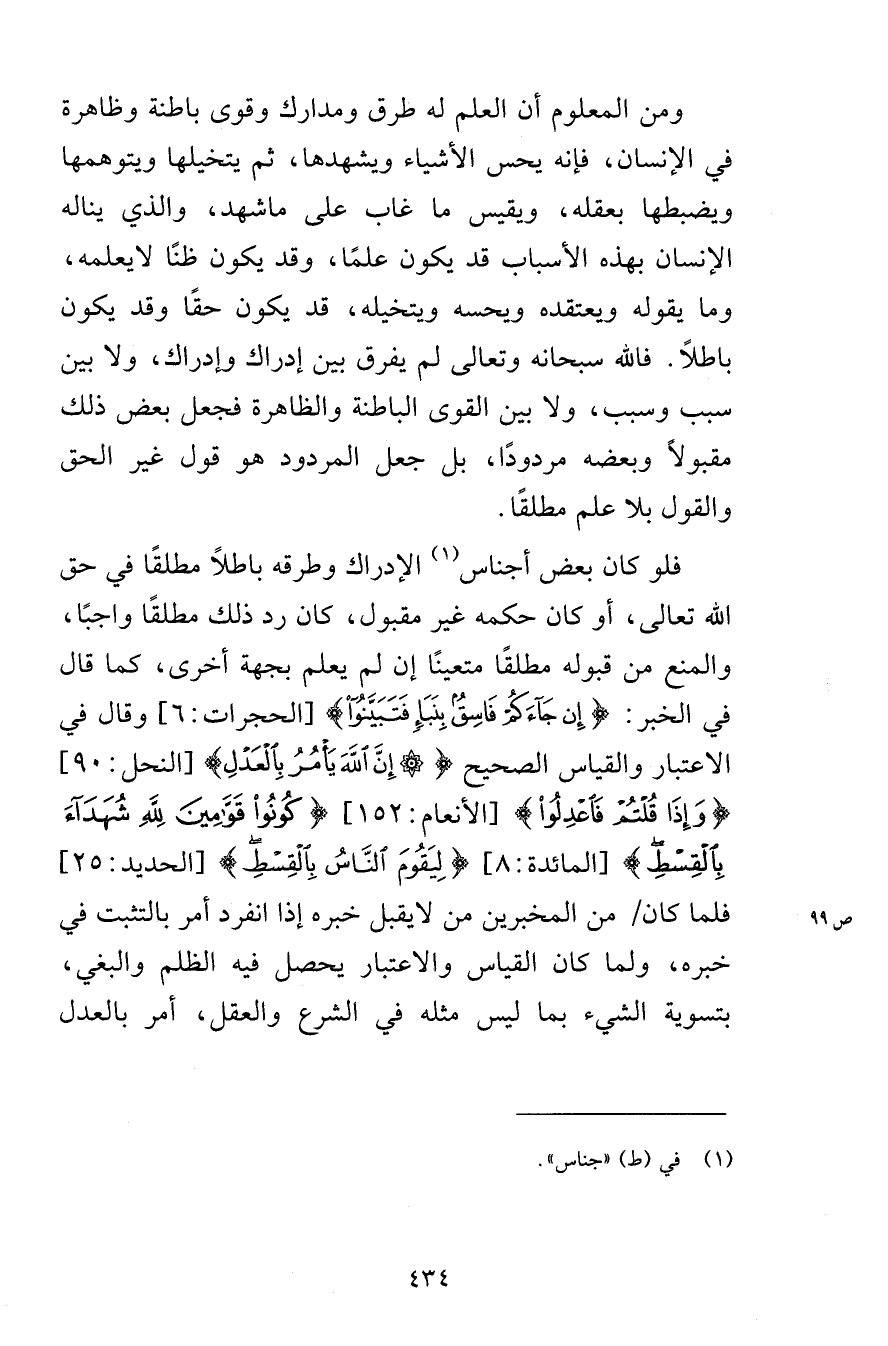 فلو كان بعض أجناس الإدراك وطرقه باطلًا مطلقًا في حق الله تعالى، أو كان حكمه غير مقبول، كان رد ذلك مطلقًا واجبًا، والمنع من قبوله مطلقًا متعينًا إن لم يعلم بجهة أخرى، كما قال في الخبر: {إِن جَاءَكُمْ فَاسِقٌ بِنَبَإٍ فَتَبَيَّنُوا} [الحجرات: 6] وقال في الاعتبار والقياس الصحيح {إِنَّ اللَّهَ يَأْمُرُ بِالْعَدْلِ} [النحل: 90] {وَإِذَا قُلْتُمْ فَاعْدِلُوا} [الأنعام: 152] {كُونُوا قَوَّامِينَ لِلَّهِ شُهَدَاءَ بِالْقِسْطِ} [المائدة: 8] {لِيَقُومَ النَّاسُ بِالْقِسْطِ} [الحديد: 25] فلما كان من المخبرين من لا يقبل خبره إذا انفرد أمر بالتثبت في خبره، ولما كان القياس والاعتبار يحصل فيه الظلم والبغي، بتسوية الشيء بما ليس مثله في الشرع والعقل، أمر بالعدل