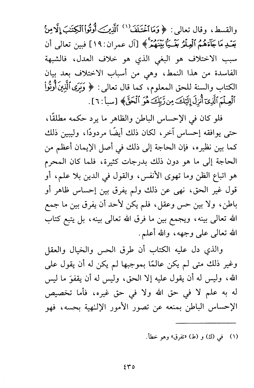 فلو كان في الإحساس الباطن والظاهر ما يرد حكمه مطلقًا، حتى يوافقه إحساس آخر، لكان ذلك أيضًا مردودًا، وليبين ذلك كما بين نظيره، فإن الحاجة إلى ذلك في أصل الإيمان أعظم من الحاجة إلى ما هو دون ذلك بدرجات كثيرة، فلما كان المحرم هو اتباع الظن وما تهوى الأنفس، والقول في الدين بلا علم، أو قول غير الحق، نهى عن ذلك ولم يفرق بين إحساس ظاهر أو باطن، ولا بين حس وعقل، فلم يكن أحد ليفرق بين ما جمع الله تعالى بينه، ويجمع بين ما فرق الله تعالى بينه، بل يتبع كتاب الله تعالى على وجهه، والله أعلم.