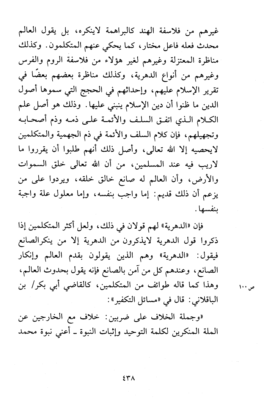 غيرهم من فلاسفة الهند كالبراهمة لا ينكره، بل يقول العالم محدث فعله فاعل مختار، كما يحكي عنهم المتكلمون. وكذلك مناظرة المعتزلة وغيرهم لغير هؤلاء من فلاسفة الروم والفرس وغيرهم من أنواع الدهرية، وكذلك مناظرة بعضهم بعضًا في تقرير الإسلام عليهم، وإحداثهم في الحجج التي سموها أصول الدين ما ظنوا أن دين الإسلام ينبني عليها. وذلك هو أصل علم الكلام الذي اتفق السلف والأئمة على ذمه وذم أصحابه وتجهيلهم، فإن كان كلام السلف والأئمة في ذم الجهمية والمتكلمين لا يحصيه إلا الله تعالى، وأصل ذلك أنهم طلبوا أن يقرروا ما لا ريب فيه عند المسلمين، من أن الله تعالى خلق السموات والأرض، وأن العالم له صانع خالق خلقه، ويردوا على من يزعم أن ذلك قديم: إما واجب بنفسه، وإما معلول علة واجبة بنفسها.