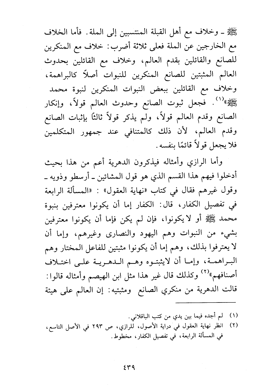 وأما الرازي وأمثاله فيذكرون الدهرية أعم من هذا بحيث أدخلوا فيهم هذا القسم الذي هو قول المشائين -أرسطو وذويه- وقول غيرهم فقال في كتاب «نهاية العقول» : «المسألة الرابعة في تفصيل الكفار، قال: الكفار إما أن يكونوا معترفين بنبوة محمد صلى الله عليه وسلم أو لا يكونوا، فإن لم يكن فإما أن يكونوا معترفين بشيء من النبوات وهم اليهود والنصارى وغيرهم، وإما أن لا يعترفوا بذلك، وهم إما أن يكونوا مثبتين للفاعل المختار وهم البراهمة، وإما أن لا يثبتوه وهم الدهرية على اختلاف أصنافهم» وكذلك قول غير هذا مثل ابن الهيصم وأمثاله قالوا: قالت الدهرية من منكري الصانع ومثبتيه: إن العالم على هيئة