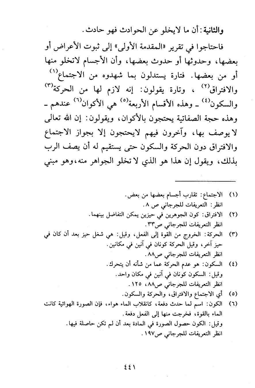 فاحتجوا في تقرير «المقدمة الأولى» إلى ثبوت الأعراض أو بعضها، وحدوثها أو حدوث بعضها، وأن الأجسام لا تخلو منها أو من بعضها. فتارة يستدلون بما شهدوه من الاجتماع والافتراق، وتارة يقولون: إنه لازم لها من الحركة والسكون -وهذه الأقسام الأربعة هي الأكوان عندهم- وهذه حجة الصفاتية يحتجون بالأكوان، ويقولون: إن الله تعالى لا يوصف بها، وآخرون فيهم لا يحتجون إلا بجواز الاجتماع والافتراق دون الحركة والسكون حتى يستقيم له أن يصف الرب بذلك، ويقول عن هذا الذي لا تخلو الجواهر منه، وهو مبني