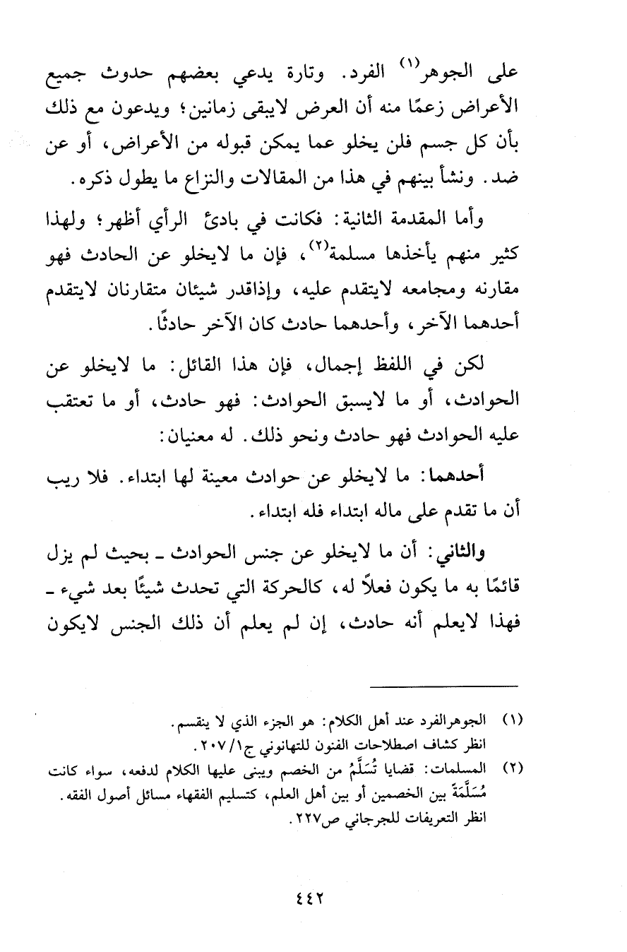 على الجوهر الفرد. وتارة يدعي بعضهم حدوث جميع الأعراض زعمًا منه أن العرض لا يبقى زمانين؛ ويدعون مع ذلك بأن كل جسم فلن يخلو عما يمكن قبوله من الأعراض، أو عن ضد. ونشأ بينهم في هذا من المقالات والنزاع ما يطول ذكره.