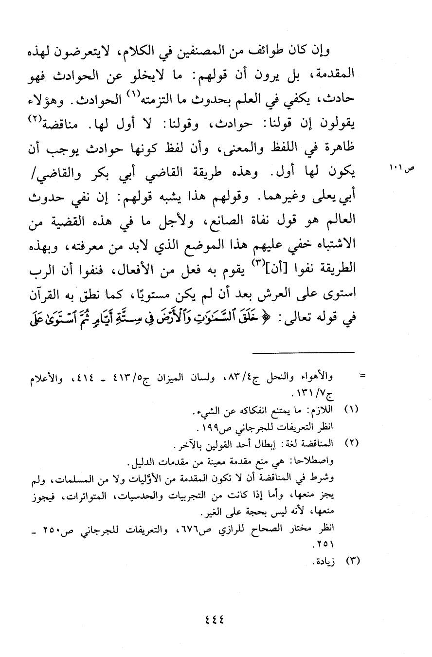 وإن كان طوائف من المصنفين في الكلام لا يتعرضون لهذه المقدمة، بل يرون أن قولهم: ما لا يخلو عن الحوادث فهو حادث، يكفي في العلم بحدوث ما التزمته الحوادث. وهؤلاء يقولون إن قولنا: حوادث، وقولنا: لا أول لها. مناقضة ظاهرة في اللفظ والمعنى، وأن لفظ كونها حوادث يوجب أن يكون لها أول. وهذه طريقة القاضي أبي بكر والقاضي أبي يعلى وغيرهما. وقولهم هذا يشبه قولهم: إن نفي حدوث العالم هو قول نفاة الصانع، ولأجل ما في هذه القضية من الاشتباه خفي عليهم هذا الموضع الذي لا بد من معرفته، وبهذه الطريقة نفوا [أن] يقوم به فعل من الأفعال، فنفوا أن الرب استوى على العرش بعد أن لم يكن مستويًا، كما نطق به القرآن في قوله تعالى: {خَلَقَ السَّمَاوَاتِ وَالْأَرْضَ فِي سِتَّةِ أَيَّامٍ ثُمَّ اسْتَوَى عَلَى
