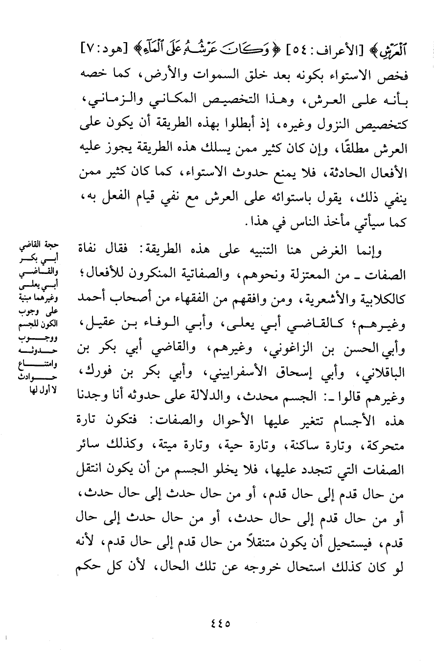 وإنما الغرض هنا التنبيه على هذه الطريقة: فقال نفاة الصفات -من المعتزلة ونحوهم، والصفاتية المنكرون للأفعال؛ كالكلابية والأشعرية، ومن وافقهم من الفقهاء من أصحاب أحمد وغيرهم؛ كالقاضي أبي يعلى، وأبي الوفاء بن عقيل، وأبي الحسن بن الزاغوني، وغيرهم، والقاضي أبي بكر بن الباقلاني، وأبي إسحاق الأسفراييني، وأبي بكر بن فورك، وغيرهم قالوا-: الجسم محدث، والدلالة على حدوثه أنا وجدنا هذه الأجسام تتغير عليها الأحوال والصفات: فتكون تارة متحركة، وتارة ساكنة، وتارة حية، وتارة ميتة، وكذلك سائر الصفات التي تتجدد عليها، فلا يخلو الجسم من أن يكون انتقل من حال قدم إلى حال قدم، أو من حال حدث إلى حال حدث، أو من حال قدم إلى حال حدث، أو من حال حدث إلى حال قدم، فيستحيل أن يكون متنقلًا من حال قدم إلى حال قدم، لأنه لو كان كذلك استحال خروجه عن تلك الحال، لأن كل حكم