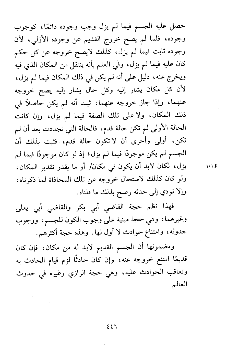 فهذا نظم حجة القاضي أبي بكر والقاضي أبي يعلى وغيرهما، وهي حجة مبنية على وجوب الكون للجسم، ووجوب حدوثه، وامتناع حوادث لا أول لها، وهذه حجة أكثرهم.