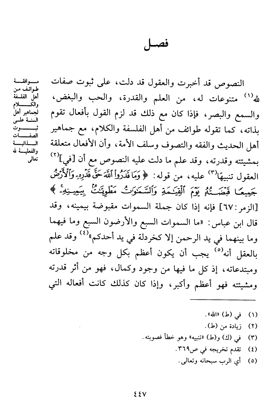 النصوص قد أخبرت والعقول قد دلت، على ثبوت صفات لله متنوعات له، من العلم والقدرة، والحب والبغض، والسمع والبصر، فإذا كان مع ذلك قد لزم القول بأفعال تقوم بذاته، كما تقوله طوائف من أهل الفلسفة والكلام، مع جماهير أهل الحديث والفقه والتصوف وسلف الأمة، وأن الأفعال متعلقة بمشيئته وقدرته، وقد علم ما دلت عليه النصوص مع أن [في] العقول تنبيهًا عليه، من قوله: {وَمَا قَدَرُوا اللَّهَ حَقَّ قَدْرِهِ وَالْأَرْضُ جَمِيعًا قَبْضَتُهُ يَوْمَ الْقِيَامَةِ وَالسَّماوَاتُ مَطْوِيَّاتٌ بِيَمِينِهِ} [الزمر: 67] فإنه إذا كان جملة السموات مقبوضة بيمينه، وقد قال ابن العباس: «ما السموات والسبع والأرضون السبع وما فيهما وما بينهما في يد الرحمن إلا كخردلة في يد أحدكم» وقد علم بالعقل أنه يجب أن يكون أعظم بكل وجه من مخلوقاته ومبتدعاته، إذ كل ما فيها من وجود وكمال، فهو من أثر قدرته ومشيئته فهو أعظم وأكبر، وإذا كان كذلك كانت أفعاله التي