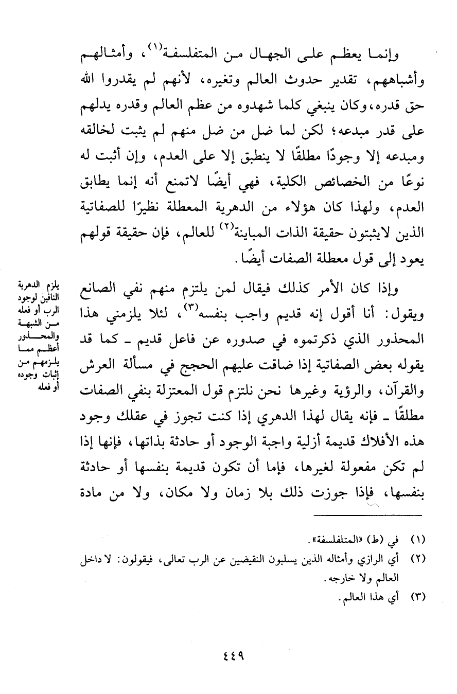 وإنما يعظم على الجهال من المتفلسفة، وأمثالهم وأشباههم، تقدير حدوث العالم وتغيره، لأنهم لم يقدروا الله حق قدره، وكان ينبغي كلما شهدوه من عظم العالم وقدره يدلهم على قدر مبدعه؛ لكن لما ضل من ضل منهم لم يثبت لخالقه ومبدعه وجودًا مطلقًا لا ينطبق إلا على العدم، وإن أثبت له نوعًا من الخصائص الكلية، فهي أيضًا لا تمنع أنه إنما يطابق العدم، ولهذا كان هؤلاء من الدهرية المعطلة نظيرًا للصفاتية الذين لا يثبتون حقيقة الذات المباينة للعالم، فإن حقيقة قولهم يعود إلى قول معطلة الصفات أيضًا.