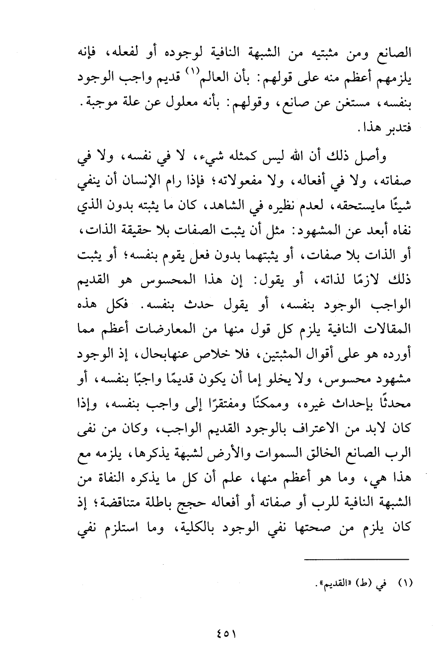 وأصل ذلك أن الله ليس كمثله شيء، لا في نفسه، ولا في صفاته، ولا في أفعاله، ولا مفعولاته؛ فإذا رام الإنسان أن ينفي شيئًا ما يستحقه، لعدم نظيره في الشاهد، كان ما يثبته بدون الذي نفاه أبعد عن المشهود: مثل أن يثبت الصفات بلا حقيقة الذات، أو الذات بلا صفات، أو يثبتهما بدون فعل يقوم بنفسه؛ أو يثبت ذلك لازمًا لذاته، أو يقول: إن هذا المحسوس هو القديم الواجب الوجود بنفسه، أو يقول حدث بنفسه. فكل هذه المقالات النافية يلزم كل قول منها من المعارضات أعظم مما أورده هو على أقوال المثبتين، فلا خلاص عنها بحال، إذ الوجود مشهود محسوس، ولا يخلو إما أن يكون قديمًا واجبًا بنفسه، أو محدثًَا بإحداث غيره، وممكنًا ومفتقرًا إلى واجب بنفسه، وإذا كان لا بد من الاعتراف بالوجود القديم الواجب، وكان من نفي الرب الصانع الخالق السموات والأرض لشبهة يذكرها، يلزمه مع هذا هي، وما هو أعظم منها، علم أن كل ما يذكره النفاة من الشبهة النافية للرب أو صفاته أو أفعاله حجج باطلة متناقضة؛ إذ كان يلزم من صحتها نفي الوجود بالكلية، وما استلزم نفي