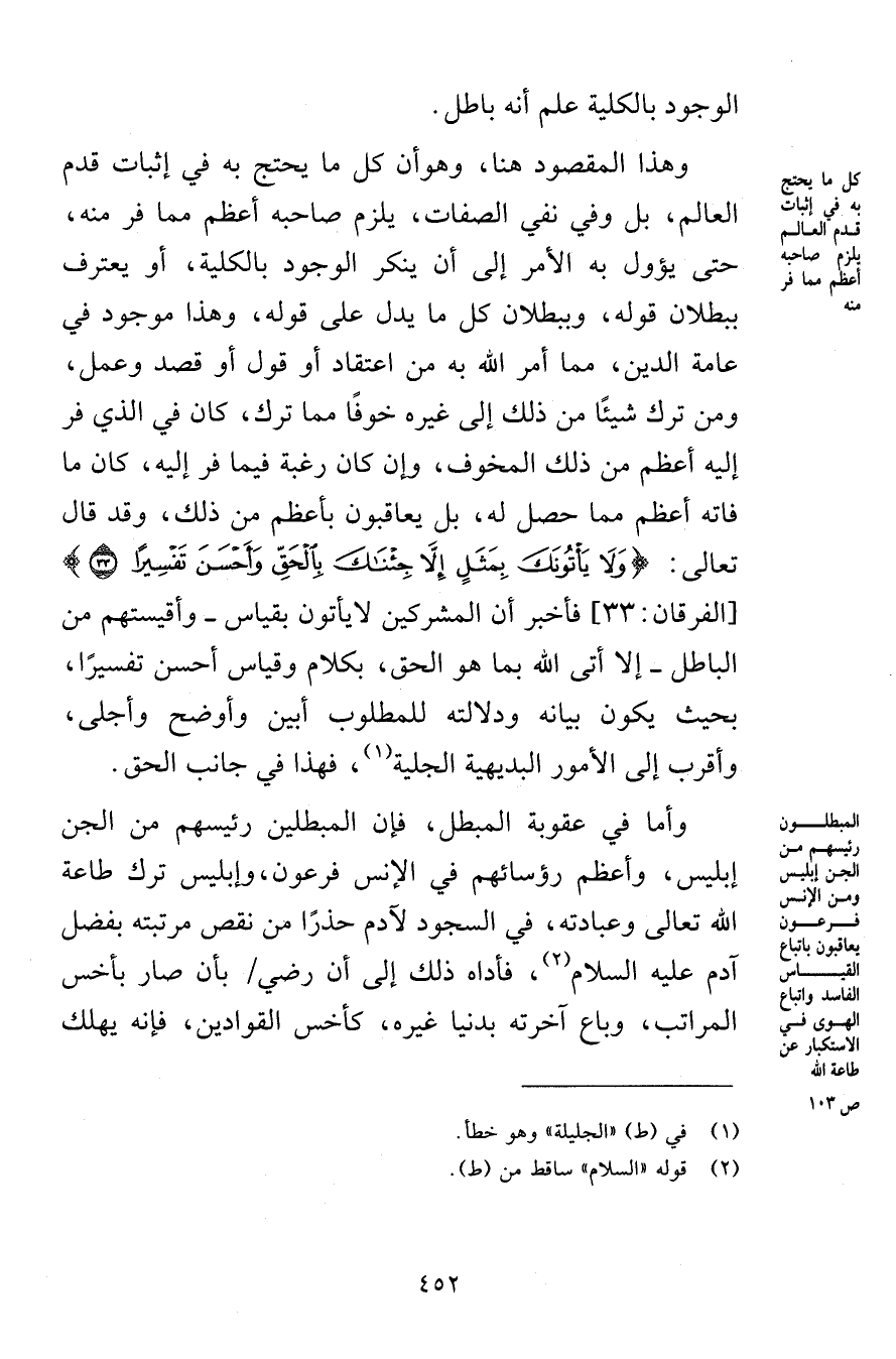 وهذا المقصود هنا، وهو أن كل ما يحتج به في إثبات قدم العالم، بل وفي نفي الصفات، يلزم صاحبه أعظم مما فر منه، حتى يؤول به الأمر إلى أن ينكر الوجود بالكلية، أو يعترف ببطلان قوله، وببطلان كل ما يدل على قوله، وهذا موجود في عامة الدين، مما أمر الله به من اعتقاد أو قول أو قصد وعمل، ومن ترك شيئًا من ذلك إلى غيره خوفًا مما ترك، كان في الذي فر إليه أعظم من ذلك المخوف، وإن كان رغبة فيما فر إليه، كان ما فاته أعظم مما حصل له، بل يعاقبون بأعظم من ذلك، وقد قال تعالى: {وَلَا يَأْتُونَكَ بِمَثَلٍ إِلَّا جِئْنَاكَ بِالْحَقِّ وَأَحْسَنَ تَفْسِيرًا (33) } [الفرقان: 33] فأخبر أن المشركين لا يأتون بقياس -وأقيستهم من الباطل- إلا أتى الله بما هو الحق، بكلام وقياس أحسن تفسيرًا، بحيث يكون بيانه ودلالته للمطلوب أبين وأوضح وأجلى، وأقرب إلى الأمور البديهية الجلية، فهذا في جانب الحق.