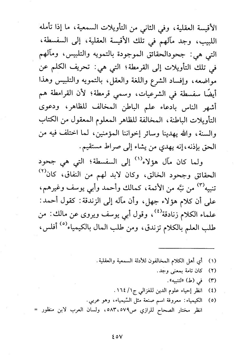 الأقيسة العقلية، وفي الثاني من التأويلات السمعية، ما إذا تأمله اللبيب، وجد مآلهم في تلك الأقيسة العقلية، إلى السفسطة، التي هي: جحود الحقائق الموجودة بالتمويه والتلبيس، ومآلهم في تلك التأويلات إلى القرمطة؛ التي هي: تحريف الكلم عن مواضعه، وإفساد الشرع واللغة والعقل، بالتمويه والتلبيس وهذا أيضًا سفسطة في الشرعيات، وسمي قرمطة؛ لأن القرامطة هم أشهر الناس بادعاء علم الباطن المخالف للظاهر، ودعوى التأويلات الباطنة، المخالفة للظاهر المعلوم المعقول من الكتاب والسنة، والله يهدينا وسائر إخواننا المؤمنين، لما اختلف فيه من الحق بإذنه، إنه يهدي من يشاء إلى صراط مستقيم.