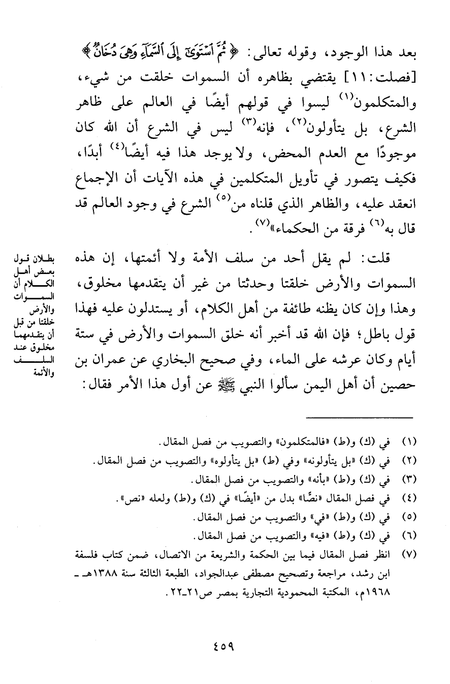 بعد هذا الوجود، وقوله تعالى: {ثُمَّ اسْتَوَى إِلَى السَّمَاءِ وَهِيَ دُخَانٌ} [فصلت: 11] يقتضي بظاهره أن السماء خلقت من شيء، والمتكلمون ليسوا في قولهم أيضًا في العالم على ظاهر الشرع، بل يتأولون، فإنه ليس في الشرع أن الله كان موجودًا مع العدم المحض، ولا يوجد هذا فيه أيضًا أبدًا؛ فكيف يتصور في تأويل المتكلمين في هذه الآيات أن الإجماع انعقد عليه، والظاهر الذي قلناه من الشرع في وجود العالم قد قال به فرقة من الحكماء» .