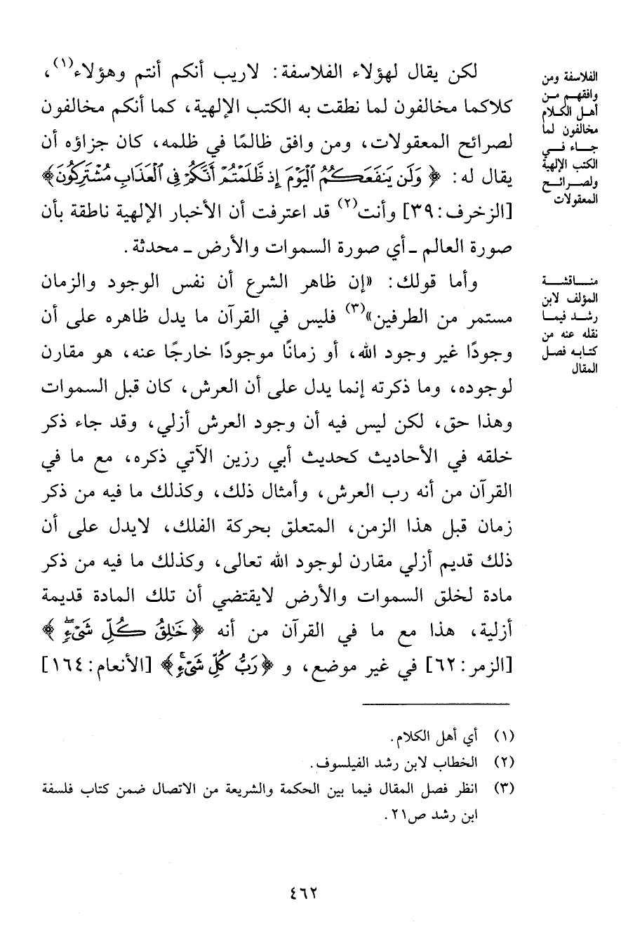 وأما قولك: «إن ظاهر الشرع أن نفس الوجود والزمان مستمر من الطرفين» فليس في القرآن ما يدل ظاهره على أن وجودًا غير وجود الله، أو زمانًا موجودًا خارجًا عنه، هو مقارن لوجوده، وما ذكرته إنما يدل على أن العرش، كان قبل السموات وهذا حق، لكن ليس فيه أن وجود العرش أزلي، وقد جاء ذكر خلقه في الأحاديث كحديث أبي رزين الآتي ذكره، مع ما في القرآن من أنه رب العرش، وأمثال ذلك، وكذلك ما فيه من ذكر زمان قبل هذا الزمن، المتعلق بحركة الفلك، لا يدل على أن ذلك قديم أزلي مقارن لوجود الله تعالى، وكذلك ما فيه من ذكر مادة لخلق السموات والأرض لا يقتضي أن تلك المادة قديمة أزلية، هذا مع ما في القرآن من أنه {خَالِقُ كُلِّ شَيْءٍ} [الزمر: 62] في غير موضع، و {رَبُّ كُلِّ شَيْءٍ} [الأنعام: 164]