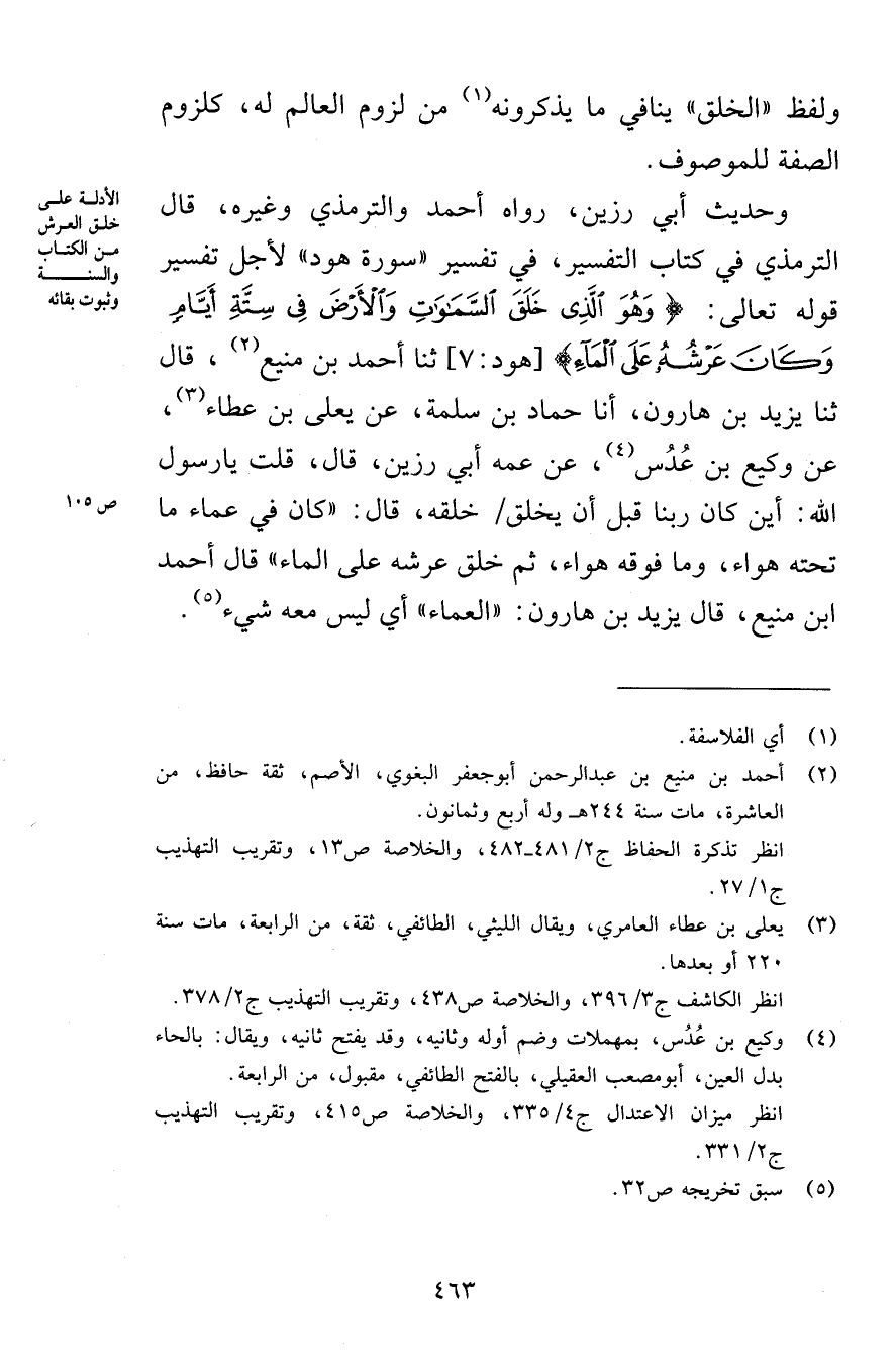 وحديث أبي رزين، رواه أحمد والترمذي وغيره، قال الترمذي في كتاب التفسير، في تفسير «سورة هود» لأجل تفسير قوله تعالى: {وَهُوَ الَّذِي خَلَقَ السَّمَاوَاتِ وَالْأَرْضَ فِي سِتَّةِ أَيَّامٍ وَكَانَ عَرْشُهُ عَلَى الْمَاءِ} [هود: 7] ثنا أحمد بن منيع، قال ثنا يزيد بن هارون، أنا حماد بن سلمة، عن يعلى بن عطاء، عن وكيع بن عُدُس، عن عمه أبي رزين، قال، قلت يارسول الله: أين كان ربنا قبل أن يخلق خلقه، قال: «كان في عماء ما تحته هواء، وما فوقه هواء، ثم خلق عرشه على الماء» قال أحمد بن منيع، قال يزيد بن هارون: «العماء» أي ليس معه شيء.