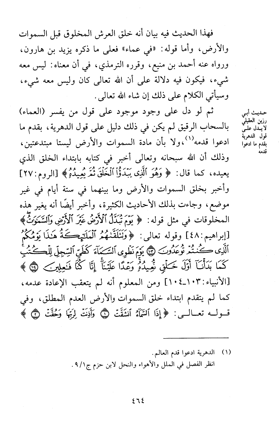 ثم لو دل على وجود موجود على قول من يفسر (العماء) بالسحاب الرقيق لم يكن في ذلك دليل على قول الدهرية، بقدم ما ادعوا قدمه، ولا بأن مادة السموات والأرض ليستا مبتدعتين، وذلك أن الله سبحانه وتعالى أخبر في كتابه بابتداء الخلق الذي يعيده، كما قال: {وَهُوَ الَّذِي يَبْدَأُ الْخَلْقَ ثُمَّ يُعِيدُهُ} [الروم: 27] وأخبر بخلق السموات والأرض وما بينهما في ستة أيام في غير موضع، وجاءت بذلك الأحاديث الكثيرة، وأخبر أيضًا أنه يغير هذه المخلوقات في مثل قوله: {يَوْمَ تُبَدَّلُ الْأَرْضُ غَيْرَ الْأَرْضِ وَالسَّمَاوَاتُ} [إبراهيم: 48] وقوله تعالى: {وَتَتَلَقَّاهُمُ الْمَلَائِكَةُ هَذَا يَوْمُكُمُ الَّذِي كُنتُمْ تُوعَدُونَ (103) يَوْمَ نَطْوِي السَّمَاءَ كَطَيِّ السِّجِلِّ لِلْكُتُبِ كَمَا بَدَأْنَا أَوَّلَ خَلْقٍ نُّعِيدُهُ وَعْدًا عَلَيْنَا إِنَّا كُنَّا فَاعِلِينَ (104) } [الأنبياء: 103-104] ومن المعلوم أنه لم يتعقب الإعادة عدمه، كما لم يتقدم ابتداء خلق السموات والأرض العدم المطلق، وفي قوله تعالى: {إِذَا السَّمَاءُ انشَقَّتْ (1) وَأَذِنَتْ لِرَبِّهَا وَحُقَّتْ (2) }