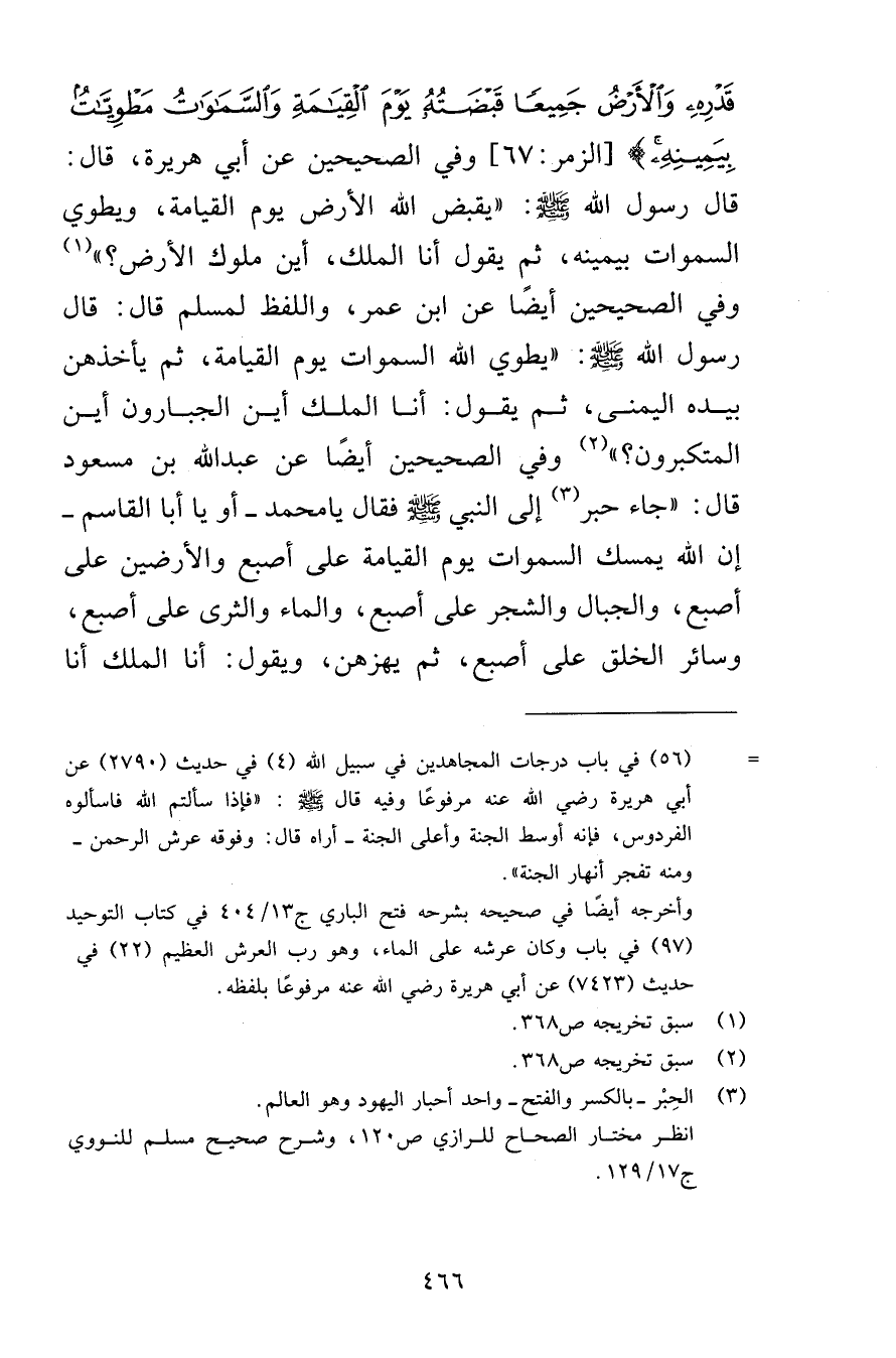 قَدْرِهِ وَالْأَرْضُ جَمِيعًا قَبْضَتُهُ يَوْمَ الْقِيَامَةِ وَالسَّمَاوَاتُ مَطْوِيَّاتٌ بِيَمِينِهِ} [الزمر: 67] وفي الصحيحين عن أبي هريرة، قال: قال رسول الله صلى الله عليه وسلم: «يقبض الله الأرض يوم القيامة، ويطوي السموات بيمينه، ثم يقول أنا الملك، أين ملوك الأرض؟» وفي الصحيحين أيضًا عن ابن عمر، واللفظ لمسلم قال: قال رسول الله صلى الله عليه وسلم: «يطوي الله السموات يوم القيامة، ثم يأخذهن بيده اليمنى، ثم يقول: أنا الملك أين الجبارون أين المتكبرون؟» وفي الصحيحين أيضًا عن عبد الله بن مسعود قال: «جاء حبر إلى النبي صلى الله عليه وسلم فقال يا محمد -أو يا أبا القاسم- إن الله يمسك السموات يوم القيامة على أصبع والأرضين على أصبع، والجبال والشجر على أصبع، والماء والثرى على أصبع، وسائر الخلق على أصبع، ثم يهزهن، ويقول: أنا الملك أنا
