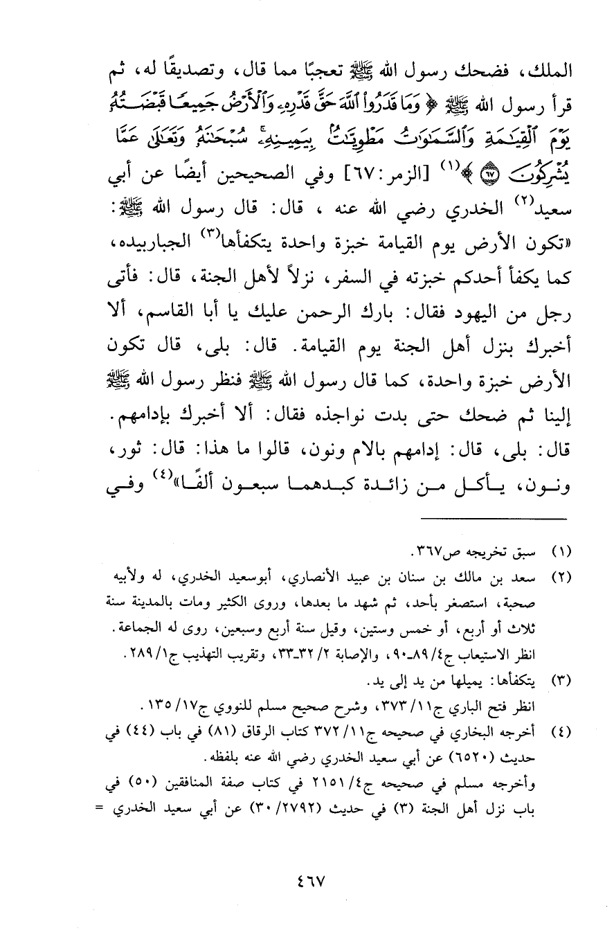 الملك، فضحك رسول الله صلى الله عليه وسلم تعجبًا مما قال، وتصديقًا له، ثم قرأ رسول الله صلى الله عليه وسلم {وَمَا قَدَرُوا اللَّهَ حَقَّ قَدْرِهِ وَالْأَرْضُ جَمِيعًا قَبْضَتُهُ يَوْمَ الْقِيَامَةِ وَالسَّمَاوَاتُ مَطْوِيَّاتٌ بِيَمِينِهِ سُبْحَانَهُ وَتَعَالَى عَمَّا يُشْرِكُونَ (67) } [الزمر: 67] وفي الصحيحين أيضًا عن أبي سعيد الخدري رضي الله عنه، قال: قال رسول الله صلى الله عليه وسلم: «تكون الأرض يوم القيامة خبزة واحدة يتكفأها الجبار بيده، كما يكفأ أحدكم خبزته في السفر، نزلًا لأهل الجنة، قال: فأتى رجل من اليهود فقال: بارك الرحمن عليك يا أبا القاسم، ألا أخبرك بنزل أهل الجنة يوم القيامة. قال: بلى، قال تكون الأرض خبزة واحدة، كما قال رسول الله صلى الله عليه وسلم فنظر رسول الله صلى الله عليه وسلم إلينا ثم ضحك حتى بدت نواجذه فقال: ألا أخبرك بإدامهم. قال: بلى، قال: إدامهم بالام ونون، قالوا ما هذا: قال: ثور، ونون، يأكل من زائدة كبدهما سبعون ألفًا» وفي