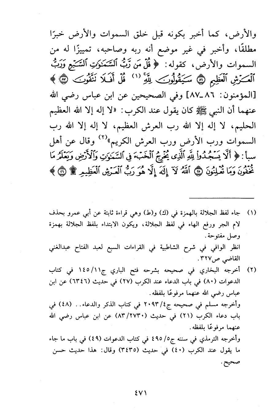والأرض، كما أخبر بكونه قبل السموات والأرض خبرًا مطلقًا، وأخبر في غير موضع أنه ربه وصاحبه، تمييزًا له من السموات والأرض، كقوله: {قُلْ مَن رَّبُّ السَّمَاوَاتِ السَّبْعِ وَرَبُّ الْعَرْشِ الْعَظِيمِ (86) سَيَقُولُونَ لِلَّهِ قُلْ أَفَلَا تَتَّقُونَ (87) } [المؤمنون: 86-87] وفي الصحيحين عن ابن عباس رضي الله عنهما أن النبي صلى الله عليه وسلم كان يقول عند الكرب: «لا إله إلا الله العظيم الحليم، لا إله إلا الله رب العرش العظيم، لا إله إلا الله رب السموات ورب الأرض ورب العرش الكريم» وقال عن أهل سبأ: {أَلَّا يَسْجُدُوا لِلَّهِ الَّذِي يُخْرِجُ الْخَبْءَ فِي السَّمَاوَاتِ وَالْأَرْضِ وَيَعْلَمُ مَا تُخْفُونَ وَمَا تُعْلِنُونَ (25) اللَّهُ لَا إِلَهَ إِلَّا هُوَ رَبُّ الْعَرْشِ الْعَظِيمِ (26) }