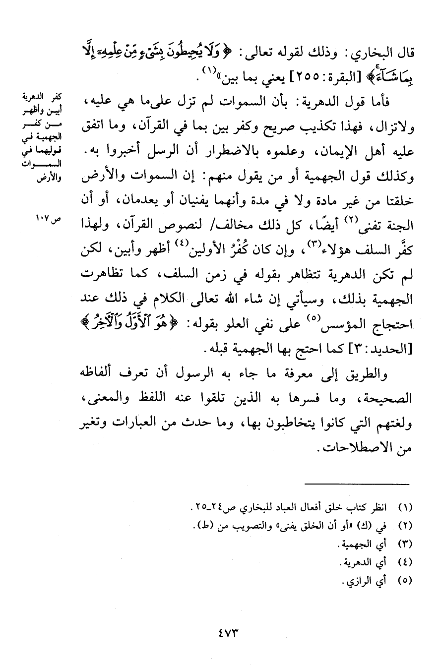 فأما قول الدهرية: بأن السموات لم تزل على ما هي عليه، ولا تزال، فهذا تكذيب صريح وكفر بين بما في القرآن، وما اتفق عليه أهل الإيمان، وعلموه بالاضطرار أن الرسل أخبروا به. وكذلك قول الجهمية أو من يقول منهم: إن السموات والأرض خلقتا من غير مادة ولا في مدة وأنهما يفنيان أو يعدمان، أو أن الجنة تفنى أيضًا، كل ذلك مخالف لنصوص القرآن، ولهذا كفَّر السلف هؤلاء، وإن كان كُفْرُ الأولين أظهر وأبين، لكن لم تكن الدهرية تتظاهر بقوله في زمن السلف، كما تظاهرت الجهمية بذلك، وسيأتي إن شاء الله تعالى الكلام في ذلك عند احتجاج المؤسس على نفي العلو بقوله: {هُوَ الْأَوَّلُ وَالْآخِرُ} [الحديد: 3] كما احتج بها الجهمية قبله.