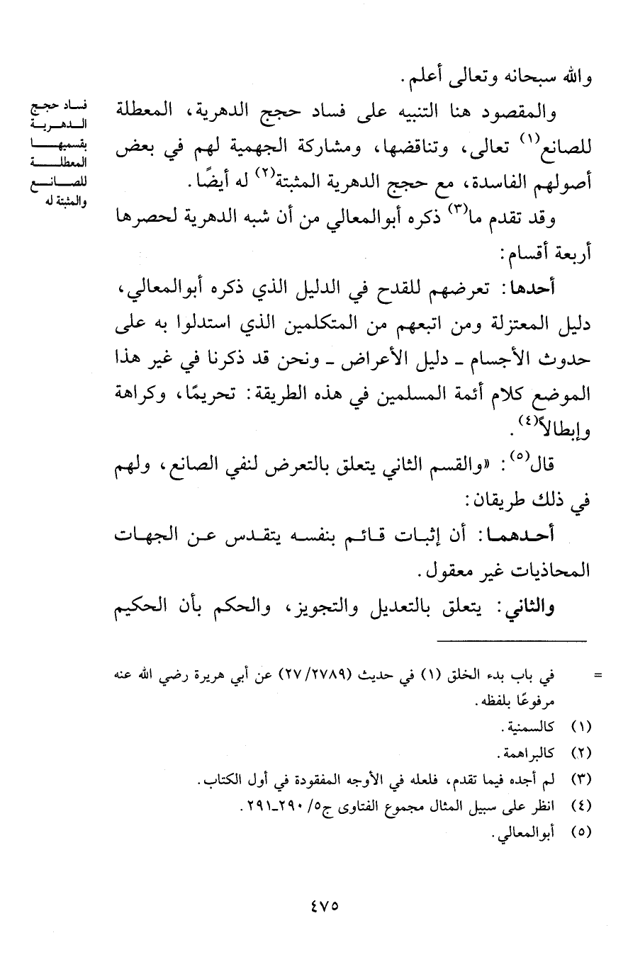 والمقصود هنا التنبيه على فساد حجج الدهرية، المعطلة للصانع تعالى، وتناقضها، ومشاركة الجهمية لهم في بعض أصولهم الفاسدة، مع حجج الدهرية المثبتة له أيضًا.