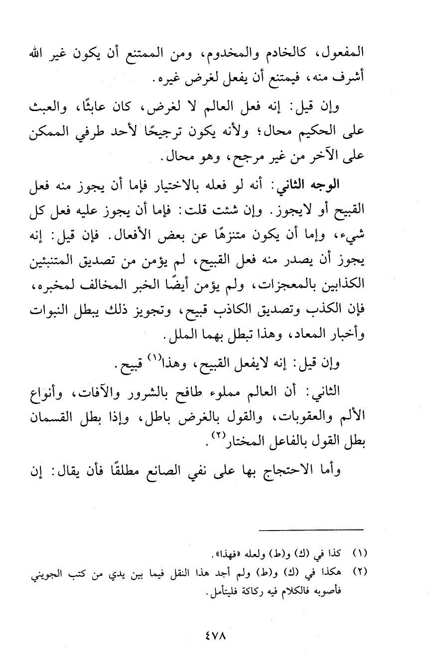الوجه الثاني: أنه لو فعل بالاختيار فإما أن يجوز منه فعل القبيح أو لا يجوز. وإن شئت قلت: فإما أن يجوز عليه فعل كل شيء، وإما أن يكون متنزهًا عن بعض الأفعال. فإن قيل: إنه يجوز أن يصدر منه فعل القبيح، لم يؤمن من تصديق المتنبئين الكذابين بالمعجزات، ولم يؤمن أيضًا الخبر المخالف لمخبره، فإن الكذب وتصديق الكاذب قبيح، وتجويز ذلك يبطل النبوات وأخبار المعاد، وهذا تبطل بهما الملل.
