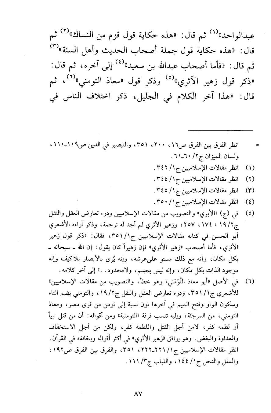عبد الواحد» ثم قال: «هذه حكاية قول قوم من النساك» ثم قال: «هذه حكاية قول جملة أصحاب الحديث وأهل السنة» ثم قال: «فأما أصحاب عبد الله بن سعيد» إلى آخره، ثم قال: «ذكر قول زهير الآثري» وذكر قول «معاذ التومني» ، ثم قال: «هذا آخر الكلام في الجليل، ذكر اختلاف الناس في