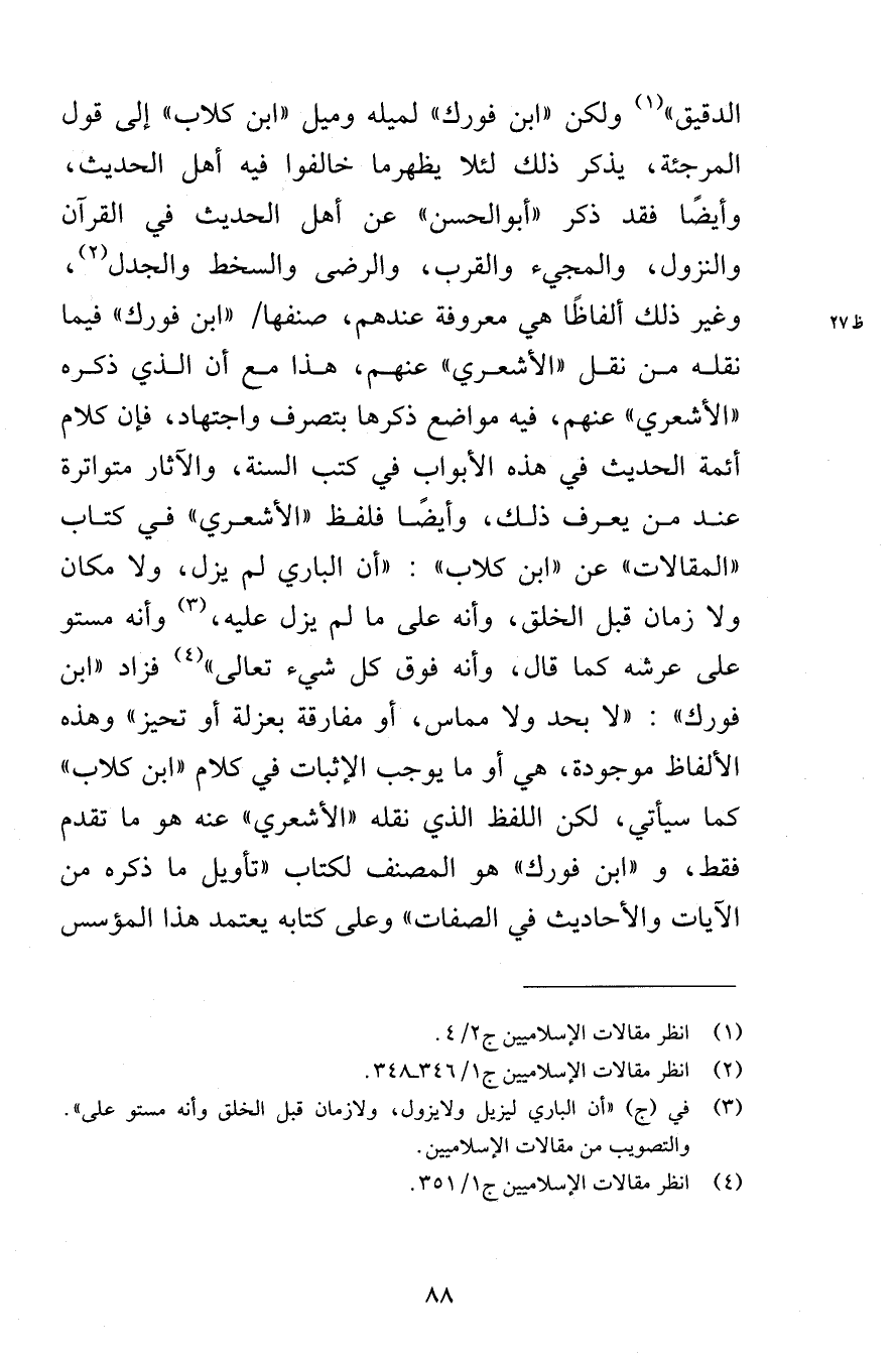 الدقيق» ولكن «ابن فورك» لميله وميل «ابن كلاب» إلى قول المرجئة، يذكر ذلك لئلا يظهر ما خالفوا فيه أهل الحديث، وأيضًا فقد ذكر «أبو الحسن» عن أهل الحديث في القرآن والنزول، والمجيء والقرب، والرضى والسخط والجدل، وغير ذلك ألفاظًا هي معروفة عندهم، صنفها «ابن فورك» فيما نقله من نقل «الأشعري» عنهم، هذا مع أن الذي ذكره «الأشعري» عنهم، فيه مواضع ذكرها بتصرف واجتهاد، فإن كلام أئمة الحديث في هذه الأبواب في كتب السنة، والآثار متواترة عند من يعرف ذلك، وأيضًا فلفظ «الأشعري» في كتاب «المقالات» عن «ابن كلاب» : «أن الباري لم يزل، ولا مكان ولا زمان قبل الخلق، وأنه على ما لم يزل عليه، وأنه مستو على عرشه كما قال، وأنه فوق كل شيء تعالى» فزاد «ابن فورك» : «لا بحد ولا مماس، أو مفارقة بعزلة أو تحيز» وهذه الألفاظ موجودة، هي أو ما يوجب الإثبات في كلام «ابن كلاب» كما سيأتي، لكن اللفظ الذي نقله «الأشعري» عنه هو ما تقدم فقط، و «ابن فورك» هو المصنف لكتاب «تأويل ما ذكره من الآيات والأحاديث في الصفات» وعلى كتابه يعتمد هذا المؤسس