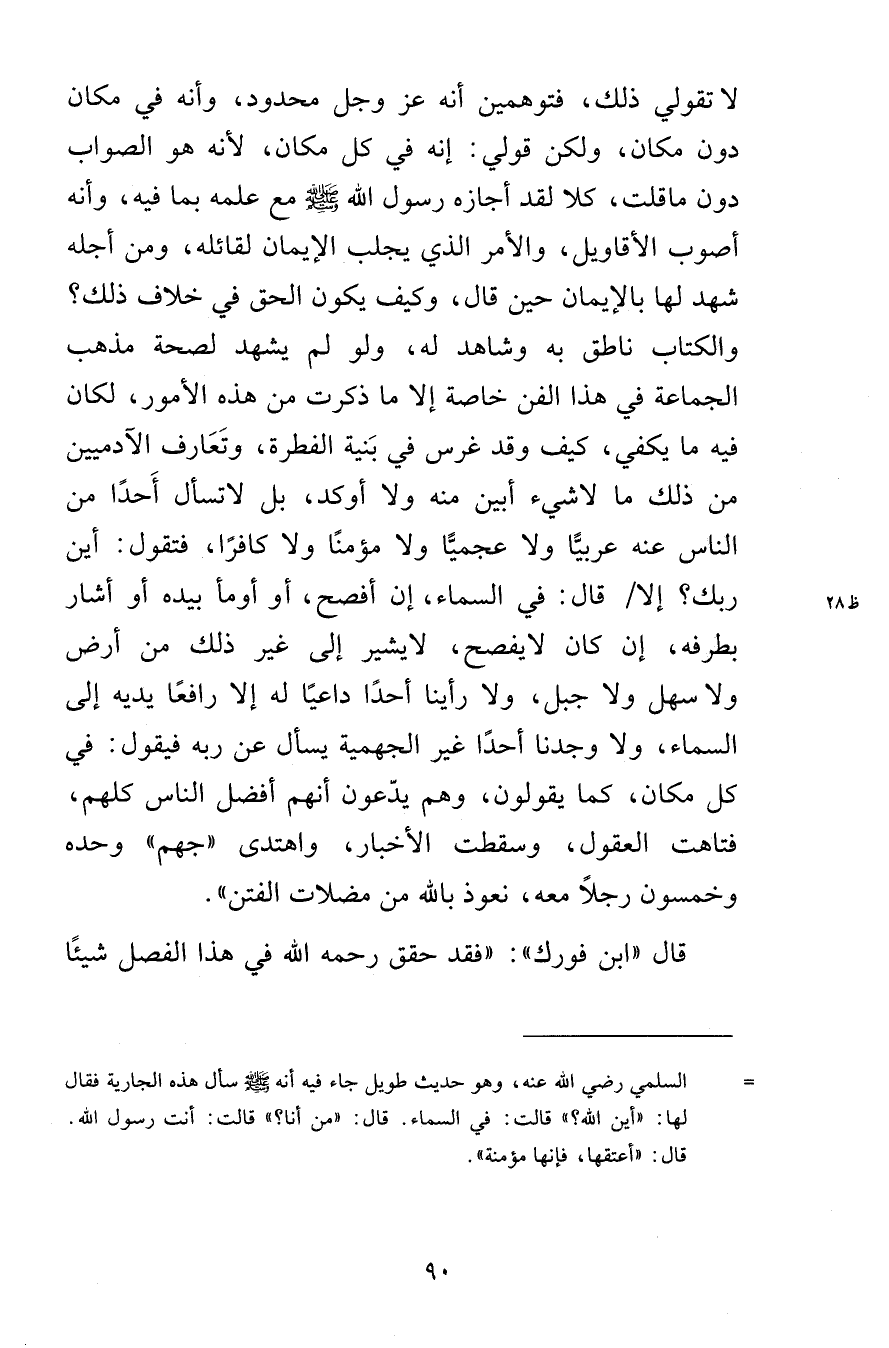 لا تقولي ذلك، فتوهمين أنه عز وجل محدود، وأنه في مكان دون مكان، ولكن قولي: إنه في كل مكان، لأنه هو الصواب دون ما قلت، كلا لقد أجازه رسول الله صلى الله عليه وسلم مع علمه بما فيه، وأنه أصوب الأقاويل، والأمر الذي يجلب الإيمان لقائله، ومن أجله شهد لها بالإيمان حين قال، وكيف يكون الحق في خلاف ذلك؟ والكتاب ناطق به وشاهد له، ولو لم يشهد لصحة مذهب الجماعة في هذا الفن خاصة إلا ما ذكرت من هذه الأمور، لكان فيه ما يكفي، كيف وقد غرس في بَنية الفطرة، وتَعَارف الآدميين من ذلك ما لا شيء أبين منه ولا أوكد، بل لاتسأل أَحدًا من الناس عنه عربيًّا ولا عجميًّا ولا مؤمنًا ولا كافرًا، فتقول: أين ربك؟ إلا قال: في السماء، إن أفصح، أو أومأ بيده أو أشار بطرفه، إن كان لا يفصح، لا يشير إلى غير ذلك من أرض ولا سهل ولا جبل، ولا رأينا أحدًا داعيًا له إلا رافعًا يديه إلى السماء، ولا وجدنا أحدًا غير الجهمية يسأل عن ربه فيقول: في كل مكان، كما يقولون، وهم يدّعون أنهم أفضل الناس كلهم، فتاهت العقول، وسقطت الأخبار، واهتدى «جهم» وحده وخمسون رجلًا معه، نعوذ بالله من مضلات الفتن» .