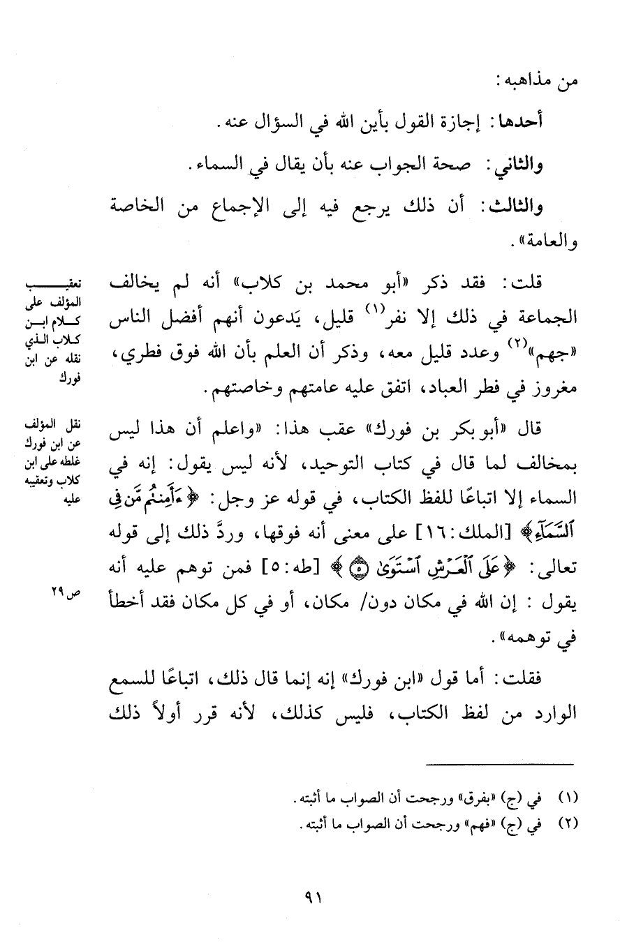 قال «أبو بكر بن فورك» عقب هذا: «واعلم أن هذا ليس بمخالف لما قال في كتاب التوحيد، لأنه ليس يقول: إنه في السماء إلا اتباعًا للفظ الكتاب، في قوله عز وجل: {أَأَمِنتُم مَّن فِي السَّمَاءِ} [الملك: 16] على معنى أنه فوقها، وردَّ ذلك إلى قوله تعالى: {الرَّحْمَنُ عَلَى الْعَرْشِ اسْتَوَى (5) } [طه: 5] فمن توهم عليه أنه يقول: إن الله في مكان دون مكان، أو في كل مكان فقد أخطأ في توهمه» .