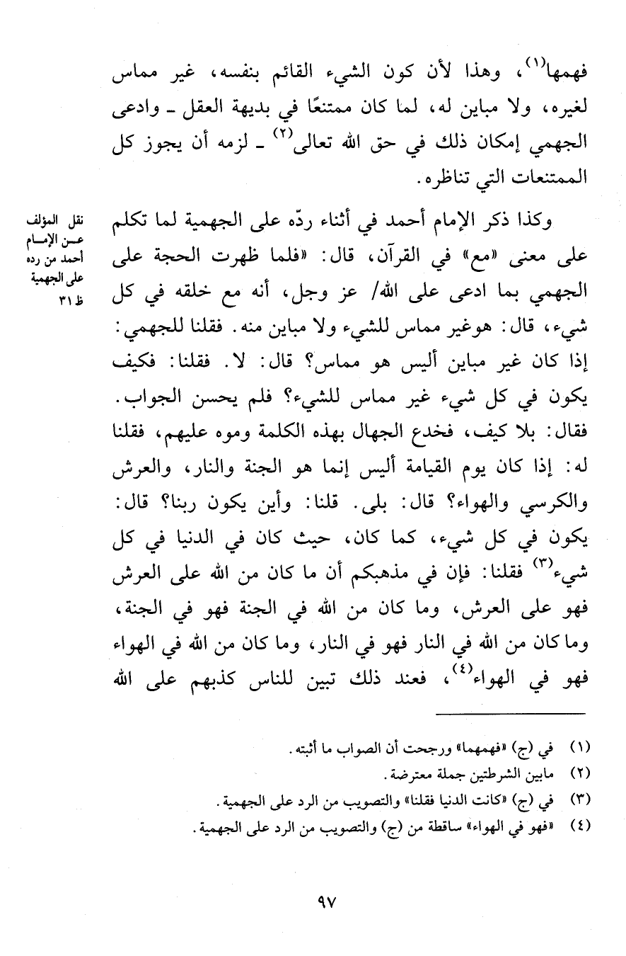 وكذا ذكر الإمام أحمد في أثناء ردّه على الجهمية لما تكلم على معنى «مع» في القرآن، قال: «فلما ظهرت الحجة على الجهمي بما ادعى على الله عز وجل، أنه مع خلقه في كل شيء، قال: هو غير مماس للشيء ولا مباين منه. فقلنا للجهمي: إذا كان غير مباين أليس هو مماس؟ قال: لا. فقلنا: فكيف يكون في كل شيء غير مماس للشيء؟ فلم يحسن الجواب. فقال: بلا كيف، فخدع الجهال بهذه الكلمة وموه عليهم، فقلنا له: إذا كان يوم القيامة أليس إنما هو الجنة والنار، والعرش والكرسي والهواء؟ قال: بلى. قلنا: وأين يكون ربنا؟ قال: يكون في كل شيء، كما كان، حيث كان في الدنيا في كل شيء. فقلنا: فإن في مذهبكم أن ما كان من الله على العرش فهو على العرش، وما كان من الله في الجنة فهو في الجنة، وما كان من الله في النار فهو في النار، وما كان من الله في الهواء فهو في الهواء، فعند ذلك تبين للناس كذبهم على الله
