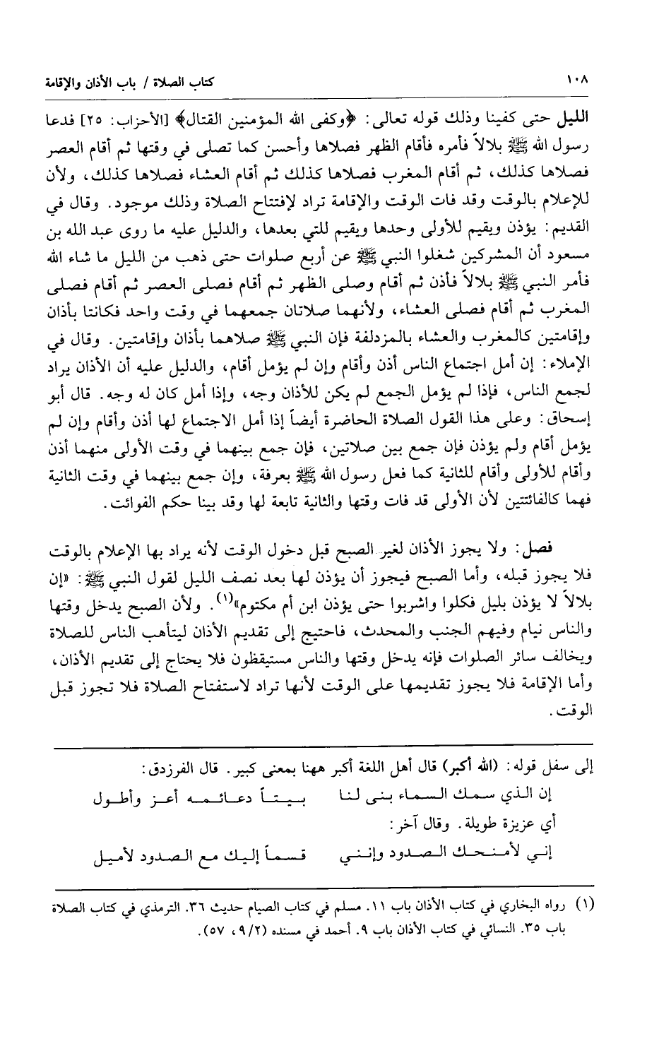 الليل حتى كفينا وذلك قوله تعالى: {وَكَفَى اللَّهُ الْمُؤْمِنِينَ الْقِتَالَ} [الأحزاب:25] فدعا رسول الله صلى الله عليه وسلم بلالاً فأمره فأقام فصلاها وأحسن كما تصلى في وقتها ثم أقام العصر فصلاها كذلك ثم أقام المغرب فصلاها كذلك ثم أقام العشاء فصلاها كذلك ولأن للإعلام بالوقت وقد فات الوقت والإقامة تراد لإفتتاح الصلاة وذلك موجود وقال في القديم: يؤذن ويقيم للأولى وحدها ويقيم للتي بعدها والدليل عليه ما روى عبد الله بن مسعود أن المشركين شغلوا النبي صلى الله عليه وسلم عن أربع صلوات حتى ذهب من الليل ما شاء الله فأمر النبي صلى الله عليه وسلم بلالاً فأذن ثم أقام وصلى الظهر ثم أقام فصلى العصر ثم أقام فصلى المغرب ثم أقام فصلى العشاء ولأنهما صلاتان جمعهما في وقت واحد فكانتا بأذان وإقامتين كالمغرب والعشاء بالمزدلفة فإن النبي صلى الله عليه وسلم صلاها بأذان وإقامتين وقال في الإملاء: إن أمل اجتماع الناس أذن وأقام وإن لم يؤمل أقام والدليل عليه أن الأذان يراد لجمع الناس فإذا لم يؤمل الجمع لم يكن للأذان وجه وإذا أمل كان له وجه قال أبو إسحاق: وعلى هذا القول الصلاة الحاضرة أيضاً إذا أمل الاجتماع لها أذن وأقام وإن لم يؤمل أقام ولم يؤذن فإن جمع بين صلاتين فإن جمع بينهما في وقت الأولى منهما أذن وأقام للأولى وأقام الثانية كما فعل رسول الله صلى الله عليه وسلم بعرفة وإن جمع بينهما في وقت الثانية فهما كالفائتتين لأن الأولى قد فات وقتها والثانية تابعة لها وقد بينا حكم الفوائت.