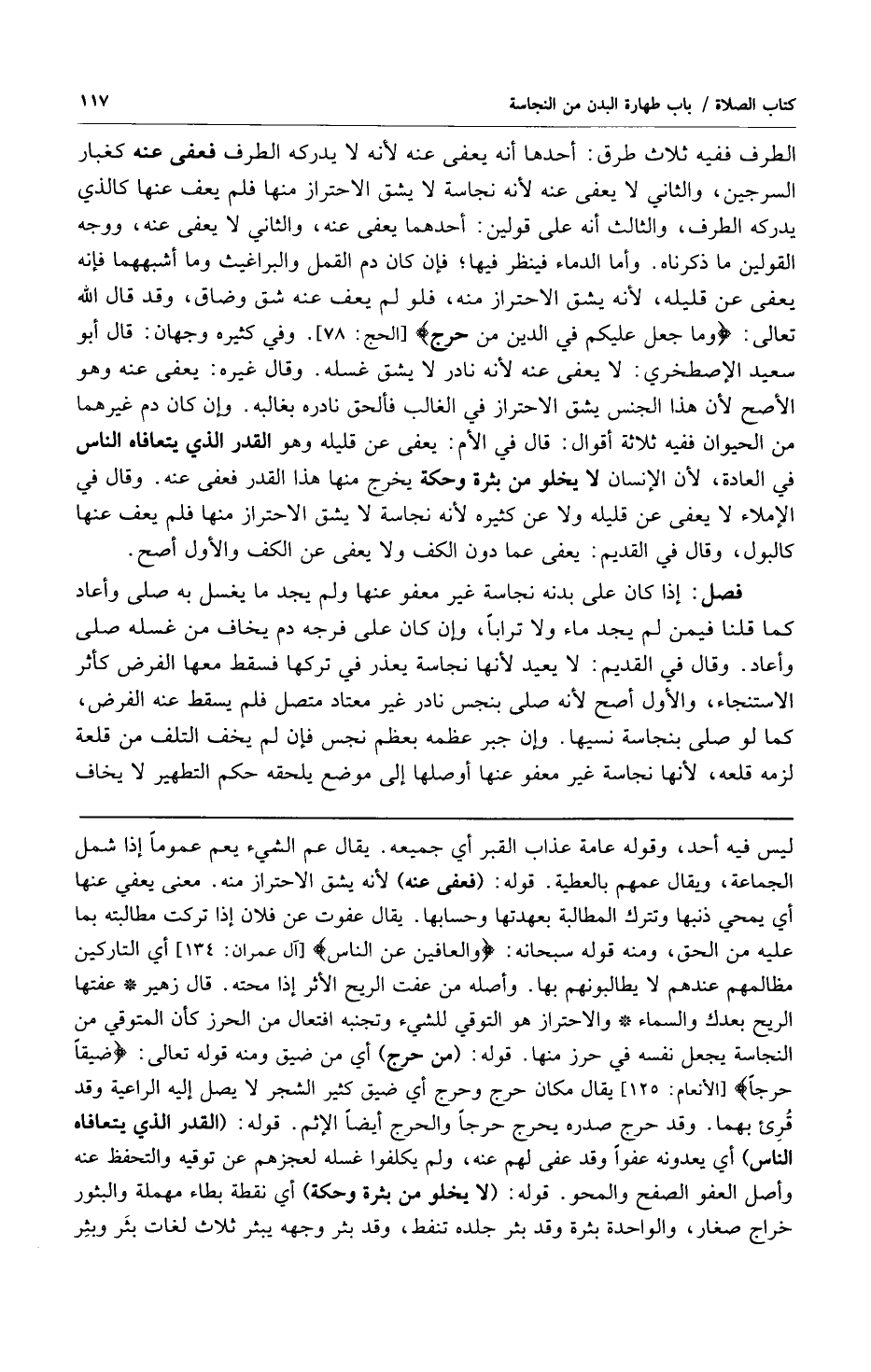 الطرف لم يعف عنه لأنه لا يشق الاحتراز منه وإن كان قدراً لا يدركه الطرف ففيه ثلاث طرق: أحدها أنه يعفى عنه لأنه لا يدركه الطرف فعفى عنه كغبار السرجين والثاني لا يعفى عنه لأنه نجاسة لا يشق الاحتراز منها فلم يعف عنها كالذي يدركه الطرف والثالث أنه على قولين: أحدهما يعفى عنه والثاني لا يعفى عنه ووجه القولين ما ذكرناه وأما الدماء فينظر فيها فإن كان دم القمل والبراغيث وما أشبههما فإنه يعفى عن قليله لأنه يشق الاحتراز منه فلو لم يعف عنه شق وضاق وقد قال الله تعالى: {وَمَا جَعَلَ عَلَيْكُمْ فِي الدِّينِ مِنْ حَرَجٍ} [الحج: 78] وفي كثيره وجهان: قال أبو سعيد الإصطخري: لا يعفى عنه لأنه نادر لا يشق غسله وقال غيره: يعفى عنه وهو الأصح لأن هذا الجنس يشق الاحتراز في الغالب فألحق نادره بغالبه وإن كان دم غيرهما من الحيوان ففيه ثلاثة أقوال: قال في الأم: يعفى عن قليله وهو القدر الذي يتعافاه الناس في العادة لأن الإنسان لا يخلو من بثرة وحكة يخرج منها هذا القدر فعفى عنه وقال في الإملاء لا يعفى عن قليله ولا عن كثيره لأنه نجاسة لا يشق الاحتراز منها فلم يعف عنها كالبول وقال في القديم: يعفى عما دون الكف ولا يعفى عن الكف والأول أصح.