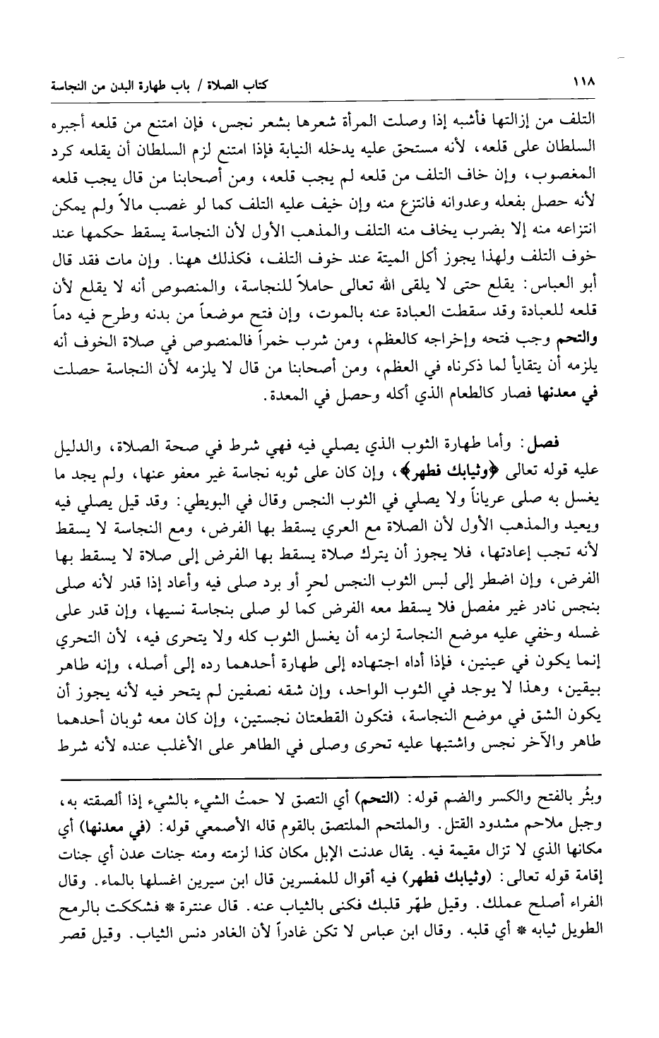 فصل: وأما طهارة الثوب الذي يصلي فيه فهي شرط في صحة الصلاة والدليل عليه قوله تعالى {وَثِيَابَكَ فَطَهِّرْ} [المدثر:4] وإن كان على ثوبه نجاسة غير معفو عنها ولم يجد ما يغسل به صلى عرياناً ولا يصلي في الثوب النجس وقال في البويطي: وقد قيل يصلي فيه ويعيد والمذهب الأول لأن الصلاة مع العري يسقط بها الفرض ومع النجاسة لا يسقط لأنه تجب إعادتها فلا يجوز أن يترك صلاة يسقط بها الفرض إلى صلاة لا يسقط بها الفرض وإن اضطر إلى لبس الثوب النجس لحر أو برد صلى فيه وأعاد إذا قدر لأنه صلى بنجس نادر غير مفصل فلا يسقط معه الفرض كما لو صلى بنجاسة نسيها وإن قدر على غسله وخفي عليه موضع النجاسة لزمه أن يغسل الثوب كله ولا يتحرى فيه لأن التحري إنما يكون في عينين فإذا أداه اجتهاده إلى طهارة أحدهما رده إلى أصله وإنه طاهر بيقين وهذا لا يوجد في الثوب الواحد وإن شقه نصفين لم يتحر فيه لأنه يجوز أن يكون الشق في موضع النجاسة فتكون القطعتان نجستين وإن كان معه ثوبان أحدهما طاهر والآخر نجس واشتبها عليه تحرى وصلى في الطاهر على الأغلب عنده لأنه شرط