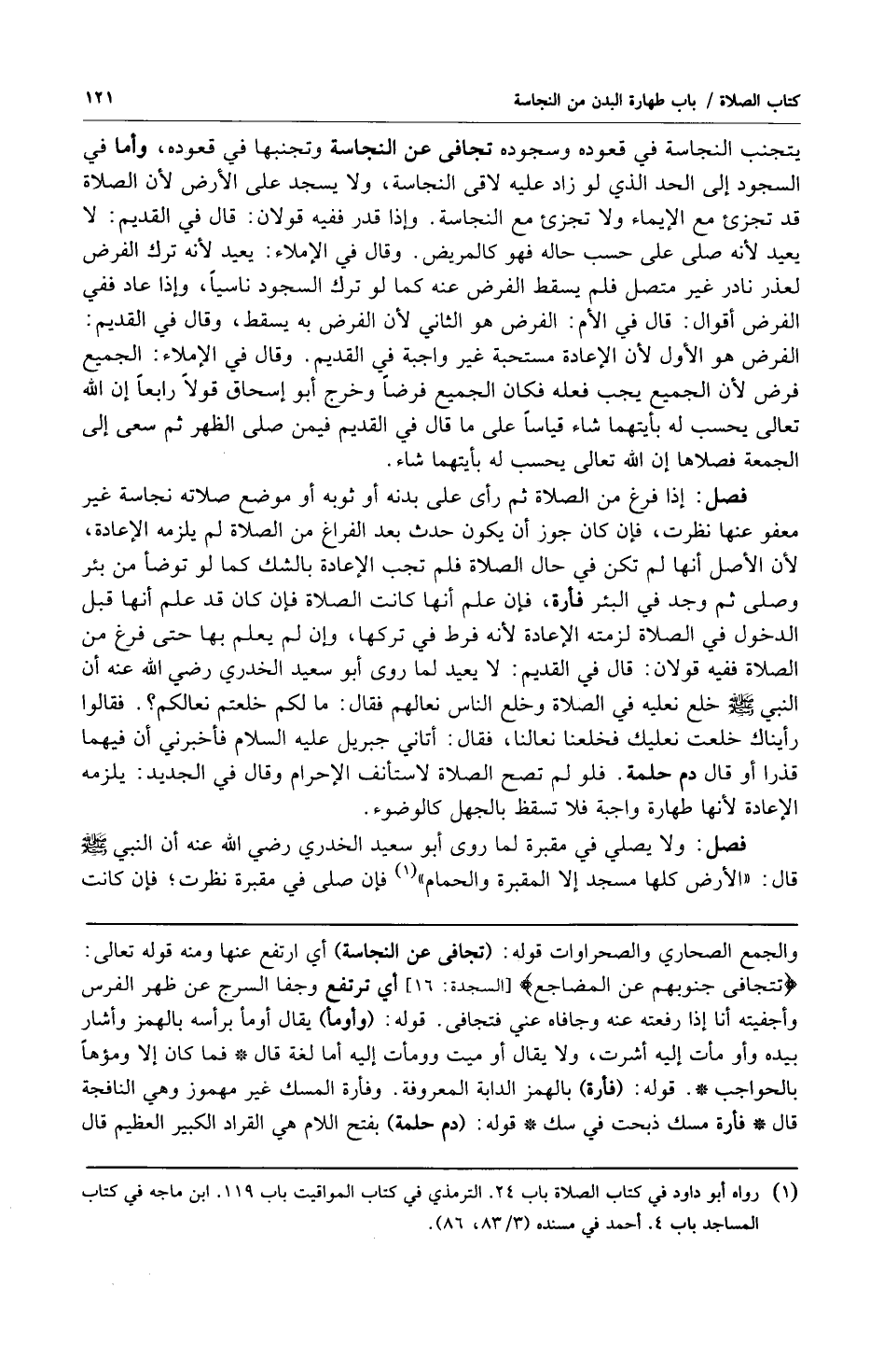 فصل: إذا فرغ من الصلاة ثم رأى على بدنه أو ثوبه أو موضع صلاته نجاسة غير معفو عنها نظرت فإن كان جوز أن يكون حدث بعد الفراغ من الصلاة لم يلزمه الإعادة لأن الأصل أنها لم تكن في حال الصلاة فلم تجب الإعادة بالشك كما لو توضأ من بئر وصلى ثم وجد في البئر فأرة فإن علم أنها كانت الصلاة فإن كان قد علم أنها قبل الدخول في الصلاة لزمته الإعادة لأنه فرط في تركها وإن لم يعلم بها حتى فرغ من الصلاة ففيه قولان: قال في القديم: لا يعيد لما روى أبو سعيد الخدري رضي الله عنه أن النبي صلى الله عليه وسلم خلع نعليه في الصلاة وخلع الناس نعالهم فقال: مالكم خلعتم نعالكم؟ فقالوا رأيناك خلعت نعليك فخلعنا نعالنا فقال: أتاني جبريل عليه السلام فأخبرني أن فيهما قذرا أو قال دم حلمة فلو لم تصح الصلاة لاستأنف الإحرام وقال في الجديد: يلزمه الإعادة لأنها طهارة واجبة فلا تسقط بالجهل كالوضوء.