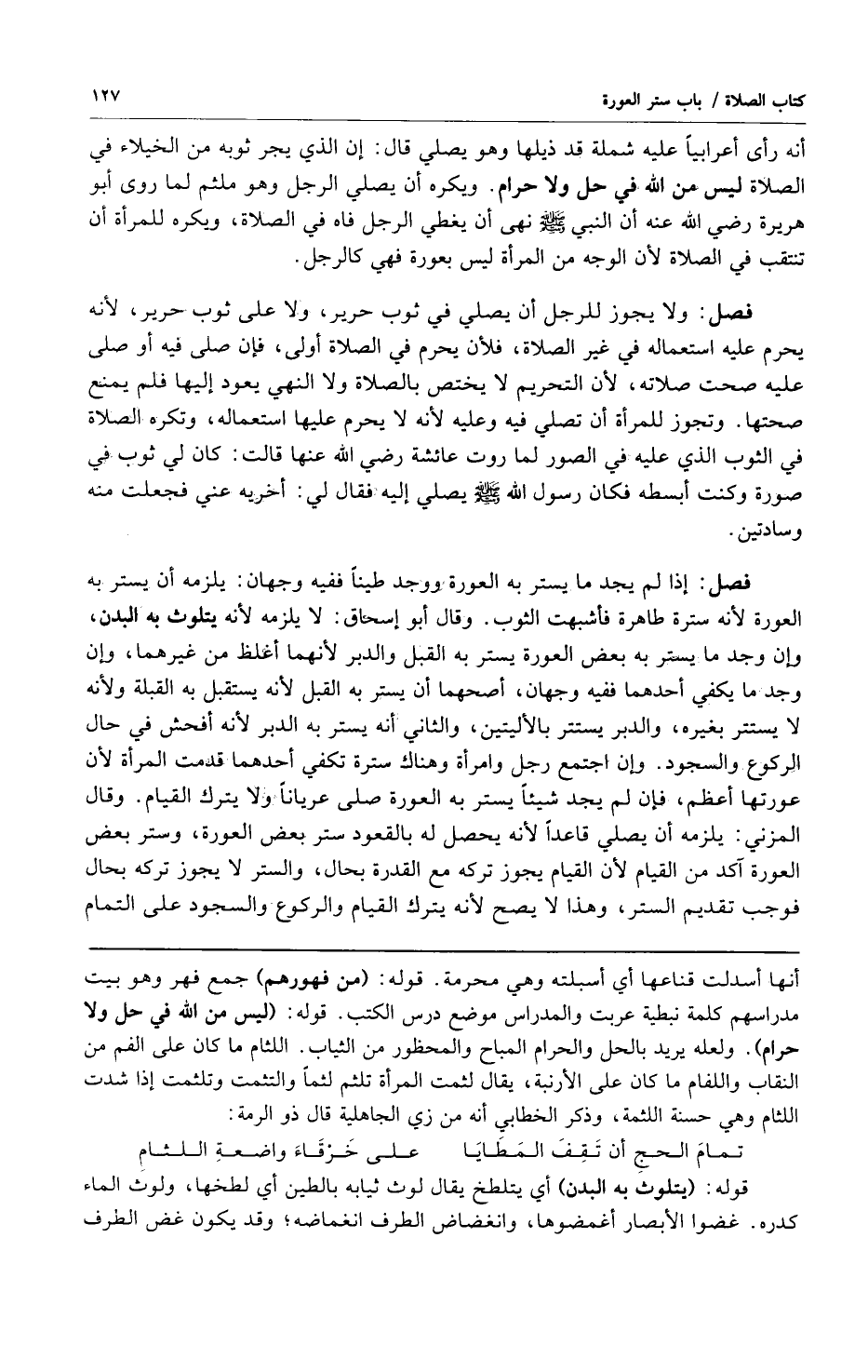 أنه رأى أعرابياً عليه شملة قد ذيلها وهو يصلي قال: إن الذي يجر ثوبه من الخيلاء في الصلاة ليس من الله في حل ولا حرام ويكره أن يصلي الرجل وهو ملثم لما روى أبو هريرة رضي الله عنه أن النبي صلى الله عليه وسلم نهى أن يغطي الرجل فاه في الصلاة ويكره للمرأة أن تنتقب في الصلاة لأن الوجه من المرأة ليس بعورة فهي كالرجل.