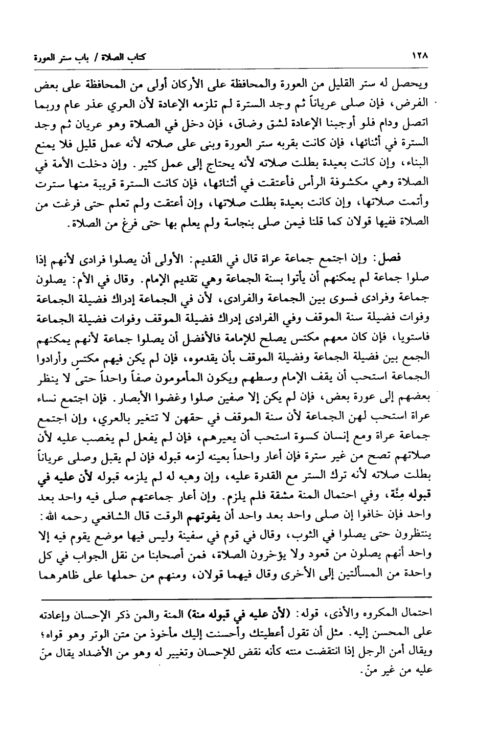ويحصل له ستر القليل من العورة والمحافظة على الأركان أولى من المحافظة على بعض الفرض فإن صلى عرياناً ثم وجد السترة لم تلزمه الإعادة لأن العري عذر عام وربما اتصل ودام فلو أوجبنا الإعادة لشق وضاق فإن دخل في الصلاة وهو عريان ثم وجد السترة في أثنائها فإن كانت بقربه ستر العورة وبنى على صلاته لأنه عمل قليل فلا يمنع البناء وإن كانت بعيدة بطلت صلاته لأنه يحتاج إلى عمل كثير وإن دخلت الأمة في الصلاة وهي مكشوفة الرأس فأعتقت في أثنائها فإن كانت السترة قريبة منها سترت وأتمت صلاتها وإن كانت بعيدة بطلت صلاتها وإن أعتقت ولم تعلم حتى فرغت من الصلاة ففيها قولان كما قلنا فيمن صلى بنجاسة ولم يعلم بها حتى فرغ من الصلاة.
