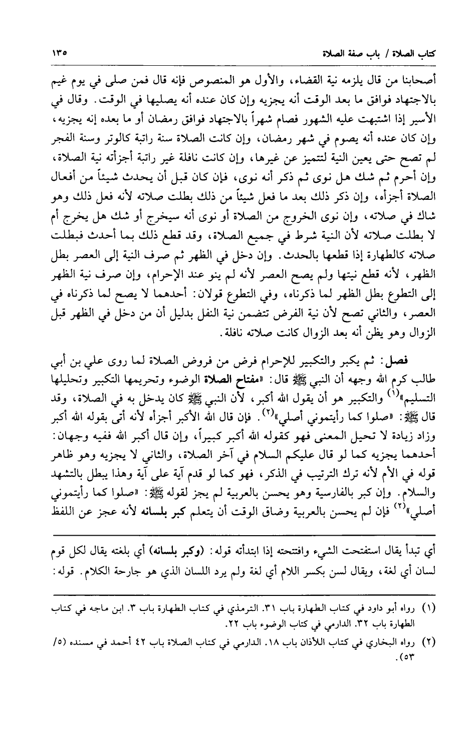 فصل: ثم يكبر والتكبير للإحرام فرض من فروض الصلاة لما روى علي بن أبي طالب كرم الله وجهه أن النبي صلى الله عليه وسلم قال: "مفتاح الصلاة الوضوء وتحريمها التكبير وتحليلها التسليم1" والتكبير هو أن يقول الله أكبر لأن النبي صلى الله عليه وسلم كان يدخل به في الصلاة وقد قال صلى الله عليه وسلم: "صلوا كما رأيتموني أصلي2" فإن قال الله أكبر أجزأه لأنه أتى بقوله الله أكبر وزاد زيادة لا تحيل المعنى فهو كقوله الله أكبر كبيراً وإن قال أكبر الله ففيه وجهان: أحدهما يجزيه كما لو قال عليكم السلام في آخر الصلاة والثاني لا يجزيه وهو ظاهر قوله في الأم لأنه ترك الترتيب في الذكر فهو كما لو قدم آية على آية وهذا يبطل بالتشهد والسلام وإن كبر بالفارسية وهو يحسن بالعربية لم يجز لقوله صلى الله عليه وسلم: "صلوا كما رأيتموني أصلي" فإن لم يحسن بالعربية وضاق الوقت أن يتعلم كبر بلسانه لأنه عجز عن اللفظ