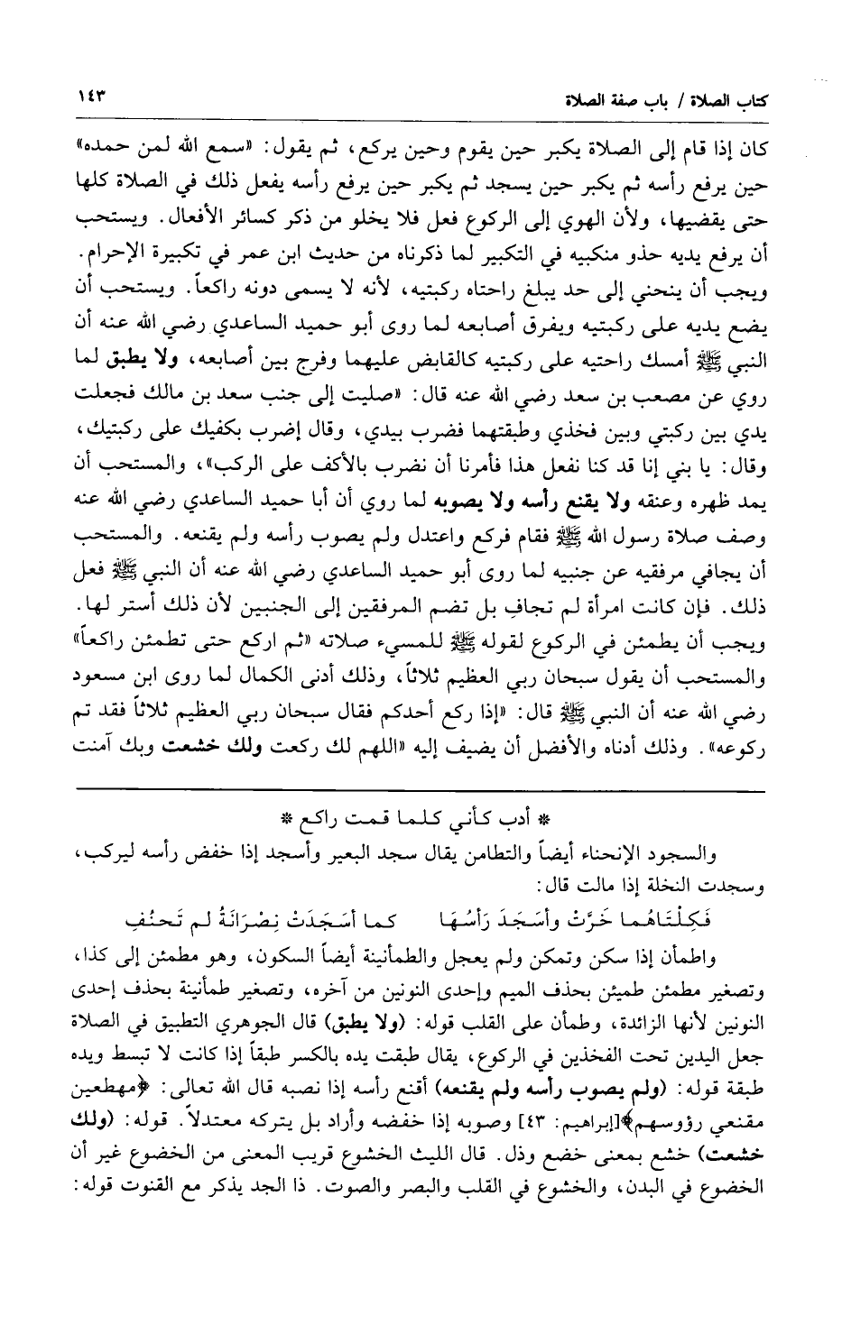 كان إذا قام إلى الصلاة يكبر حين يقوم وحين يركع" ثم يقول: سمع الله لمن حمده حين يرفع رأسه ثم يكبر حين يسجد ثم يكبر حين يرفع رأسه يفعل ذلك في الصلاة كلها حتى يقضيها ولأن الهوي إلى الركوع فعل فلا يخلو من ذكر كسائر الأفعال ويستحب أن يرفع يديه حذو منكبيه في التكبير لما ذكرناه من حديث ابن عمر في تكبيرة الإحرام ويجب أن ينحني إلى حد يبلغ راحتاه ركبتيه لأنه لا يسمى دونه راكعاً ويستحب أن يضع يديه على ركبتيه ويفرق أصابعه لما "روى أبو حميد الساعدي رضي الله عنه أن النبي صلى الله عليه وسلم أمسك راحتيه على ركبتيه كالقابض عليهما وفرج بين أصابعه" ولا يطبق لما روي عن مصعب بن سعد رضي الله عنه قال: صليت إلى جنب سعد بن مالك فجعلت يدي بين ركبتي وبين فخذي وطبقتهما فضرب بيدي وقال اضرب بكفيك على ركبتيك وقال: يا بني إنا قد كنا نفعل هذا فأمرنا أن نضرب بالأكف على الركب والمستحب أن يمد ظهره وعنقه ولا يقنع رأسه ولا يصوبه لما روي أن أبا حميد الساعدي رضي الله عنه وصف صلاة رسول الله صلى الله عليه وسلم فقام فركع واعتدل ولم يصوب رأسه ولم يقنعه والمستحب أن يجافي مرفقيه عن جنبيه لما روى أبو حميد الساعدي رضي الله عنه أن النبي صلى الله عليه وسلم فعل ذلك فإن كانت امرأة لم تجاف بل تضم المرفقين إلى الجنبين لأن ذلك أستر لها ويجب أن يطمئن في الركوع لقوله صلى الله عليه وسلم للمسيء صلاته "ثم اركع حتى تطمئن راكعاً" والمستحب أن يقول سبحان ربي العظيم ثلاثاً وذلك أدنى الكمال لما روى ابن مسعود رضي الله عنه أن النبي صلى الله عليه وسلم: قال: "إذا ركع أحدكم فقال سبحان ربي العظيم ثلاثاً فقد تم ركوعه" وذلك أدناه والأفضل أن يضيف إليه "اللهم لك ركعت ولك خشعت وبك آمنت