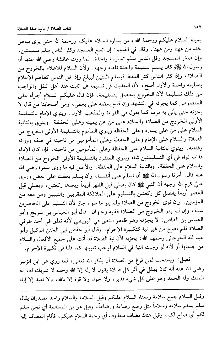 يمينه السلام عليكم ورخمة الله وعن يساره السلام عليكم ورحمة الله حتى يرى بياض خده من ههنا ومن ههنا وقال في القديم: إن اتسع المسجد وكثر الناس سلم تسليمتين وإن صغر المسجد وقل الناس تسليمة واحدة لما روت عائشة رضي الله عنها الله عنها أن رسول الله صلى الله عليه وسلم كان يسلم تسليمة واحدة تلقاء وجهه ولأن السلام للإعلام بالخروج من الصلاة وإذا كثر الناس كثر اللغط فيسلم اثنتين ليبلغ وإذا قل الناس كفاهم الإعلام بتسليمة واحدة والأول أصح لأن الحديث في تسليمه غير ثابت عند أهل النقل والواجب من ذلك تسليمة لأن الخروج يحصل بتسليمة فإن قال عليكم السلام أجزأه على المنصوص كما يجزئه في التشهد وإن قدم بعضه على بعض ومن أصحابنا من قال لا يجزئه حتى يأتي به مرتباً كما يقول في القراءة والمذهب الأول وينوي الإمام بالتسليمة الأولى الخروج من الصلاة والسلام على من عن يمينه وعلى الحفظة وينوي بالثانية السلام على من على يساره وعلى الحفظة وينوي المأموم بالتسليمة الأولى الخروج من الصلاة والتسليم على الإمام وعلى الحفظة وعلى المأمومين من ناحيته في صفه وورائه وقدامه وينوي بالثانية السلام على الحفظة وعلى المأمومين من ناحيته فإن كان الإمام قدامه نواه في أي التسليمتين شاء وينوي المنفرد بالتسليمة الأولى الخروج من الصلاة والسلام على الحفظة وبالثانية السلام على الحفظة والأصل فيه ما روى سمرة رضي الله عنه قال: أمرنا رسول الله صلى الله عليه وسلم أن نسلم على أنفسنا وأن يسلم بعضنا على بعض وروى علي كرم الله وجهه أن النبي صلى الله عليه وسلم كان يصلي قبل الظهر أربعاً وبعدها ركعتين ويصلي قبل العصر أربعاً يفصل كل ركعتين بالتسليم على الملائكة المقربين والنبيين ومن معه من المؤمنين وإن نوى الخروج من الصلاة ولم ينو ما سواه جاز لأن التسليم على الحاضرين سنة وإن لم ينو الخروج من الصلاة ففيه وجهان: قال أبو العباس بن سريج وأبو العباس بن القاص: لا يجزئه وهو ظاهر النص في البويطي لأنه نطق في أحد طرفي الصلاة فلم يصح من غير نية كتكبيرة الإحرام وقال أبو حفص ابن الختن الوكيل وأبو عبد الله الجرجاني رحمهم الله: يجزيه لأن نية الصلاة قد أتت على جميع الأفعال والسلام من جملتها أو لأنه لو وجبت النية في السلام لوجب تعيينها كما قلنا في كبيرة الإحرام.