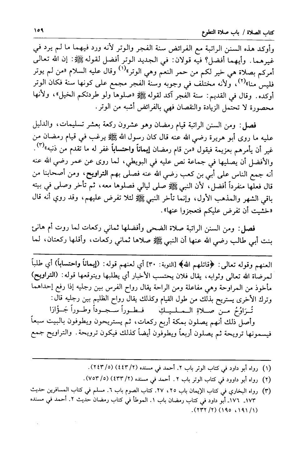 وأوكد هذه السنن الراتبة مع الفرائض سنة الفجر والوتر لأنه ورد فيهما ما لم يرد في غيرهما وأيهما أفضل؟ فيه قولان: في الجديد الوتر أفضل لقوله صلى الله عليه وسلم "إن الله تعالى أمركم بصلاة هي خير لكم من حمر النعم هي الوتر1" وقال عليه السلام "من لم يوتر فليس منا2" ولأنه مختلف في وجوبه وسنة الفجر مجمع على كونها سنة فكان الوتر أوكده وقال في القديم: سنة الفجر آكده لقوله صلى الله عليه وسلم "صلوها ولو طردتكم الخيل" ولأنها محصورة لا تحتمل الزيادة والنقصان فهي بالفرائض أشبه من الوتر.