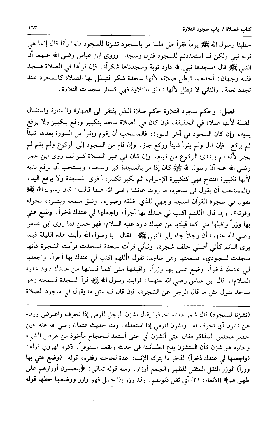 فصل: وحكم سجود التلاوة حكم صلاة النفل يفتقر إلى الطهارة والستارة واستقبال القبلة لأنها صلاة في الحقيقة فإن كان في الصلاة سجد بتكبير ورفع بتكبير ولا يرفع يديه وإن كان السجود في آخر السورة فالمستحب أن يقوم ويقرأ من السورة بعدها شيئاً ثم يركع فإن قال ولم يقرأ شيئاً وركع جاز وإن قام من السجود إلى الركوع ولم يقم لم يجز لأنه لم يبتدئ الركوع من قيام وإن كان في غير الصلاة كبر لما روى ابن عمر رضي الله عنه أن رسول الله صلى الله عليه وسلم كان إذا مر بالسجدة كبر وسجد ويستحب أن يرفع يديه لأنها تكبيرة افتتاح فهي كتكبيرة الإحرام ثم يكبر تكبيرة أخرى للسجدة ولا يرفع اليد والمستحب أن يقول في سجوده ما روت عائشة رضي الله عنها قالت: كان رسول الله صلى الله عليه وسلم يقول في سجود القرآن "سجد وجهي للذي خلقه وصوره وشق سمعه وبصره بحوله وقوته" وإن "قال اللهم اكتب لي عندك بها أجراً واجعلها لي عندك ذخراً وضع عني بها وزراً واقبلها مني كما قبلتها من عبدك داود عليه السلام" فهو حسن لما روى ابن عباس رضي الله عنهما أن رجلاً جاء إلى النبي صلى الله عليه وسلم فقال: يا رسول الله رأيت هذه الليلة فيما يرى النائم كاني أصلي خلف شجرة وكأني قرأت سجدة فسجدت فرأيت الشجرة كأنها سجدت لسجودي فسمعتها وهي ساجدة تقول اللهم اكتب لي عندك بها أجراً واجعلها لي عندك ذخراً وضع عني بها وزراً واقبلها مني كما قبلتها من عبدك داود عليه السلام قال ابن عباس رضي الله عنهما: فرأيت رسول الله صلى الله عليه وسلم قرأ السجدة فسمعته وهو ساجد يقول مثل ما قال الرجل عن الشجرة فإن قال فيه مثل ما يقول في سجود الصلاة