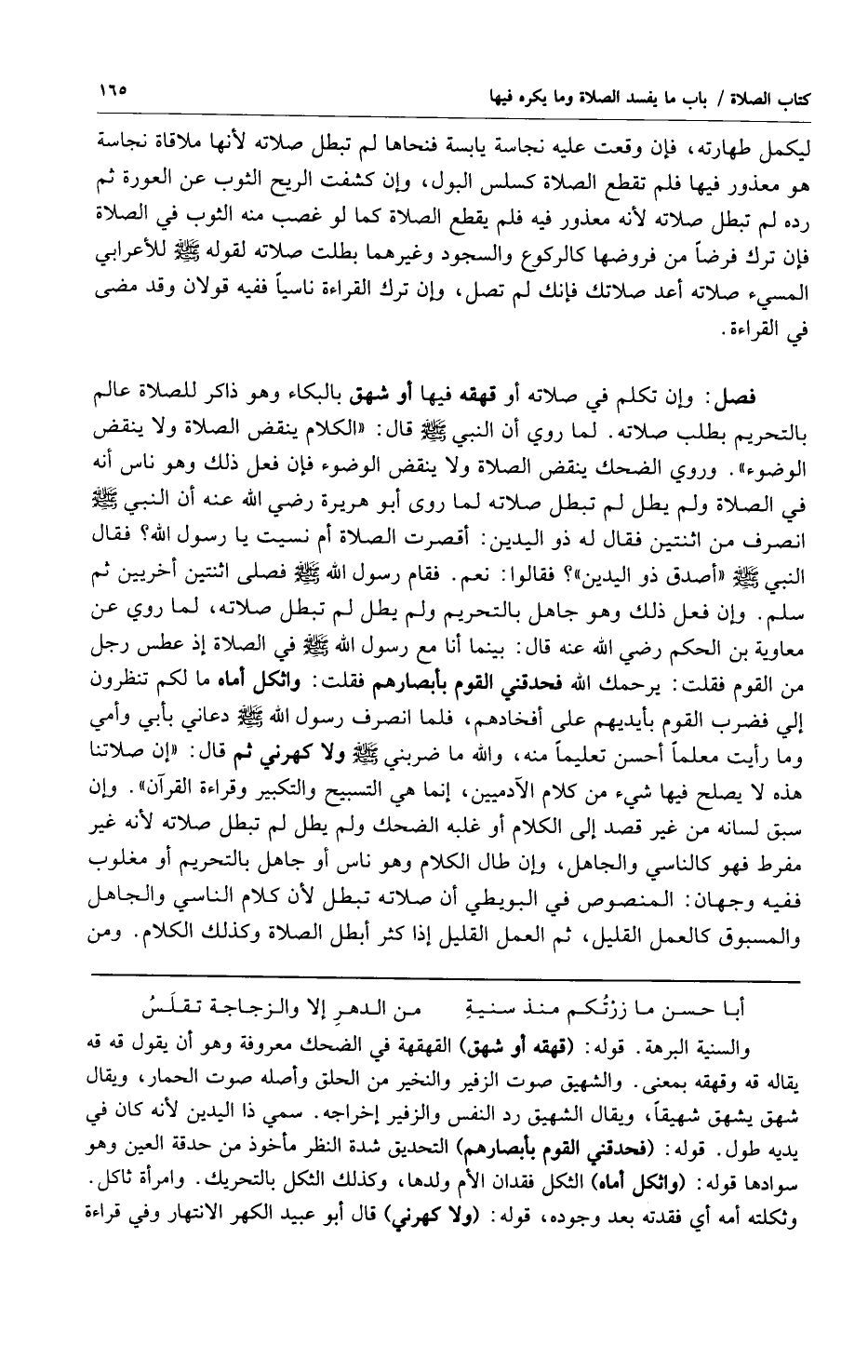 فصل: وإن تكلم في صلاته أو قهقه فيها أو شهق بالبكاء وهو ذاكر للصلاة عالم بالتحريم بطلت صلاته لما روي أن النبي صلى الله عليه وسلم قال "الكلام ينقض الصلاة ولا ينقض الوضوء" وروي الضحك ينقض الصلاة ولا ينقض الوضوء فإن فعل ذلك وهو ناس أنه في الصلاة ولم يطل لم تبطل صلاته لما روى أبو هريرة رضي الله عنه أن النبي صلى الله عليه وسلم انصرف من اثنتين فقال له ذو اليدين: أقصرت الصلاة أم نسيت يا رسول الله؟ فقال النبي صلى الله عليه وسلم "أصدق ذو اليدين"؟ فقالوا: نعم فقام رسول الله صلى الله عليه وسلم فصلى اثنتين أخريين ثم سلم وإن فعل ذلك وهو جاهل بالتحريم ولم يطل لم تبطل صلاته لما روى عن معاوية بن الحكم رضي الله عنه قال: بينما أنا مع رسول الله صلى الله عليه وسلم في الصلاة إذ عطس رجل من القوم فقلت: يرحمك الله فحدقني القوم بأبصارهم فقلت: واثكل أماه ما لكم تنظرون إلي فضرب القوم بأيديهم على أفخاذهم فلما انصرف رسول الله صلى الله عليه وسلم دعاني بأبي وأمي وما رأيت معلماً أحسن تعليماً منه والله ما ضربني صلى الله عليه وسلم ولا كهرني ثم قال "إن صلاتنا هذه لا يصلح فيها شيء من كلام الآدميين إنما هي التسبيح والتكبير وقراءة القرآن" وإن سبق لسانه من غير قصد إلى الكلام أو غلبه الضحك ولم يطل لم تبطل صلاته لأنه غير مفرط فهو كالناسي والجاهل وإن طال الكلام وهو ناس أو جاهل بالتحريم أو مغلوب ففيه وجهان: المنصوص في البويطي أن صلاته تبطل لأن كلام الناسي والجاهل والمسبوق كالعمل القليل ثم العمل القليل إذا كثر أبطل الصلاة وكذلك الكلام ومن
